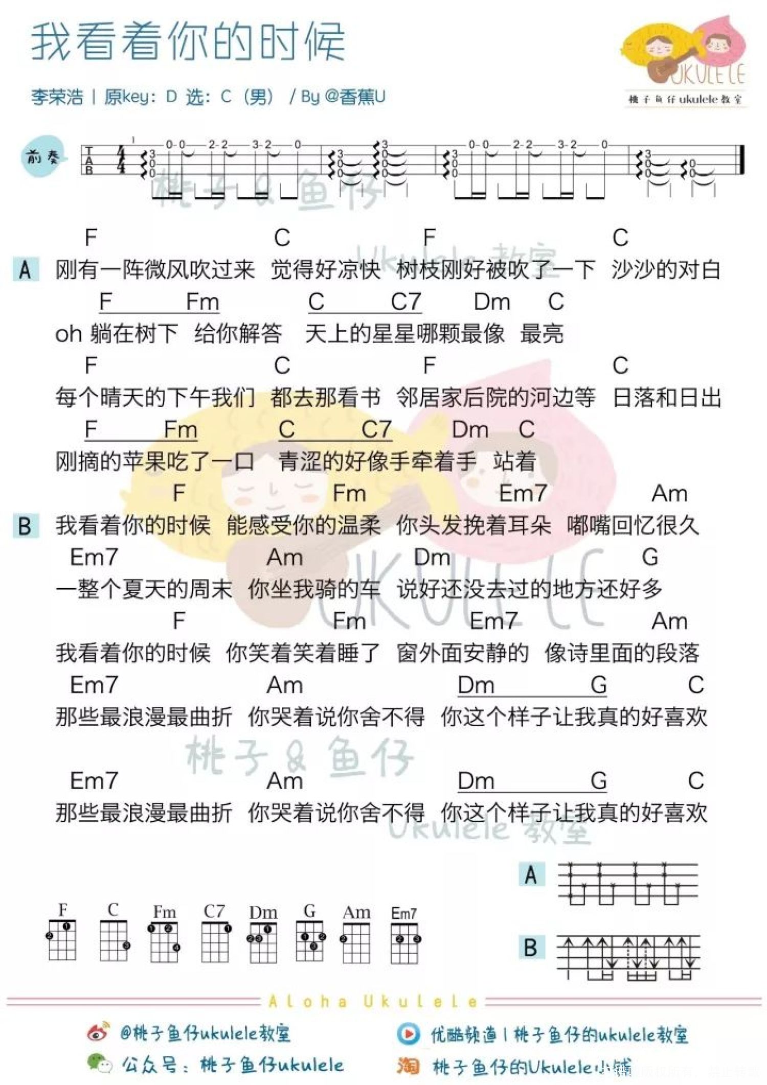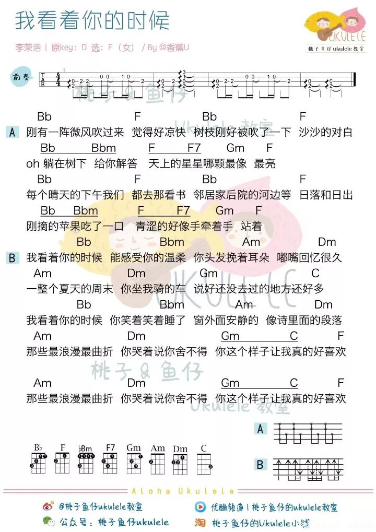 曲谱介绍: ● 迈入九月的开学期,李荣浩刚好就推出了一首充满青春校园纯爱感的新歌[我看着你的时候],他说这就是一首简单的情歌,如果[嗯]这一首歌写的是18岁的叛逆和不羁,那[我看着你的时候]就是在写18岁的羞涩和浪漫,可以说这一张专辑中有很多关于青春期的回忆! 官方MV 尤克里里谱 女生版 男生版