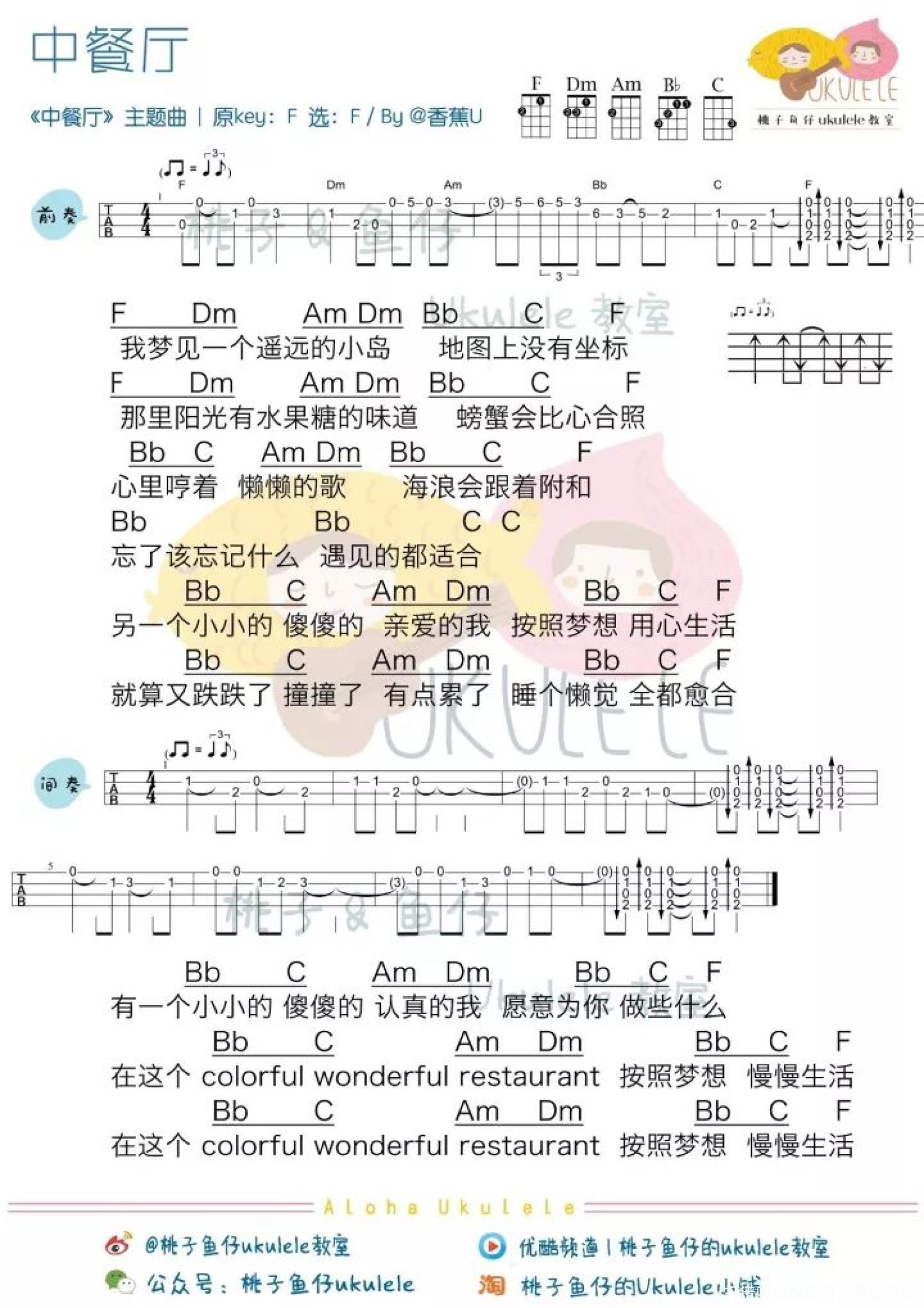 曲谱介绍:   ● 泰国象岛,螃蟹海浪,水果糖,睡懒觉... 美好的意象,来源于《中餐厅》同名主题曲的歌词。悠闲的生活令人十分向往~ 尤克里里+吉他弹唱cover   弹唱教学 + 谱 弹 唱 谱