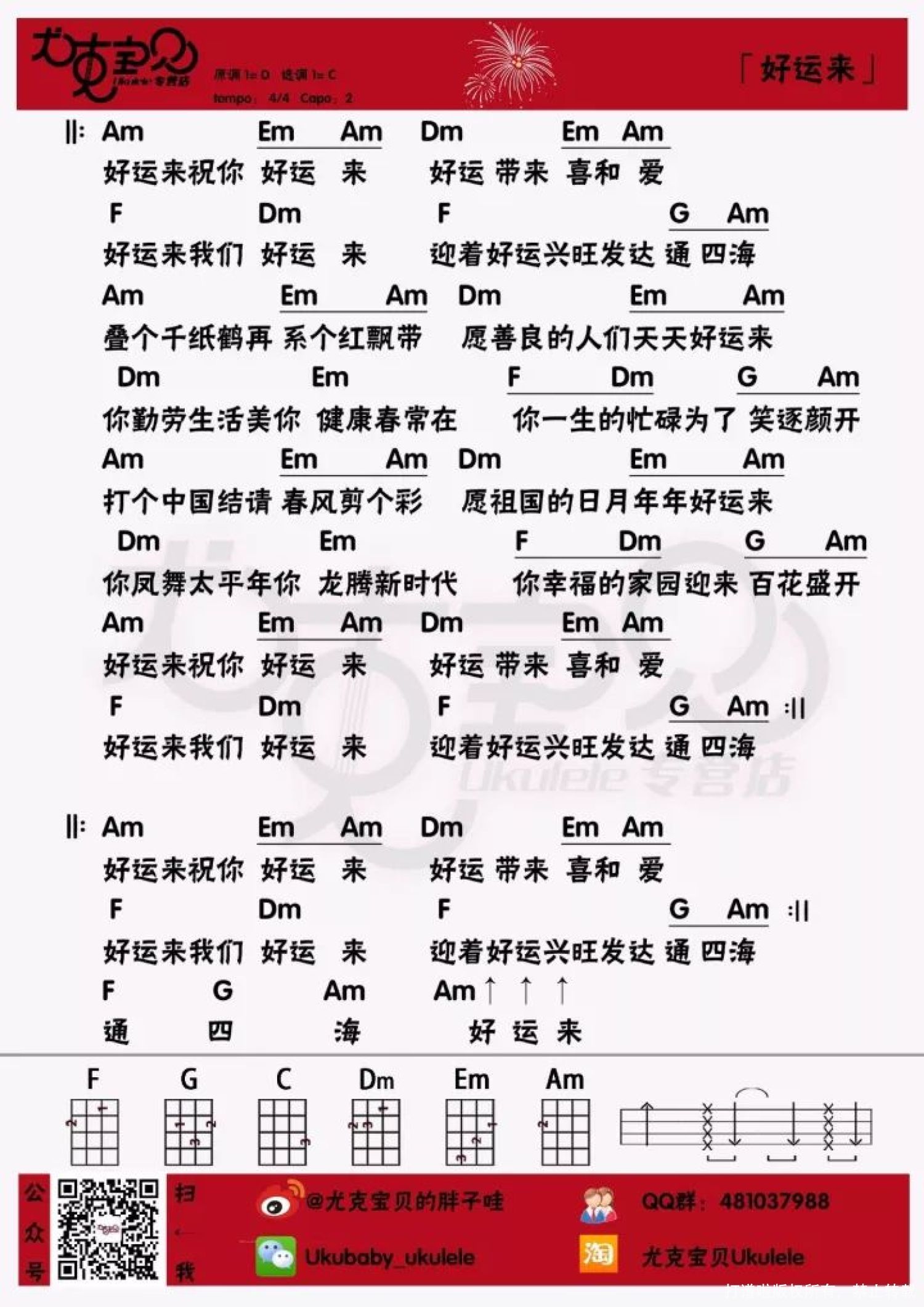 曲谱介绍: ♪ ALOHA ♪ 我 是 胖 子 哇 (耳朵准备好了,就按下播放键吧 ) ●「好运来」是车行作词,戚建波作曲,祖海演唱的歌曲,收录于祖海2004年1月17日发行的《好运来》专辑中,是春晚的主旋律曲目。 ● 《好运来》是歌曲《好日子》的姊妹篇,这首歌不仅曲风欢快、喜庆祥和 、旋律优美,歌词更是琅琅上口、亲切而不失大气。 ● 由原唱祖海和嘻哈唱将GAI共同演绎的《羞羞的铁拳》推广曲《好运来》,一个是民歌歌手,一个是嘻哈歌手,此次两人搭档演绎经典歌曲《好运来》,堪称是一次大胆又有趣的合作,民歌加上嘻哈,曲风十分混搭,又好听又洗脑。 ● “其实没得必要那么的忙,给自己放个假到处去逛,开心从不需要哪个允许,好运锦鲤时刻在你身旁”,个人风格独特的GAI还在歌曲里加入了rap歌词,十分带感。  《羞羞的铁拳》推广曲《好运来》MV   ● 该MV除了延续歌曲本身的喜庆元素,还出现了代表“好运”的锦鲤。置身于一群锦鲤中的祖海和GAI彻底玩嗨了,一边旋转一边发锦鲤,寓意着“转发锦鲤送好运”。是开心麻花第三部电影《羞羞的铁拳》推广曲。   Ukulele Cover By 胖子哇 感谢喵喵等灯特别出演   曲谱部分