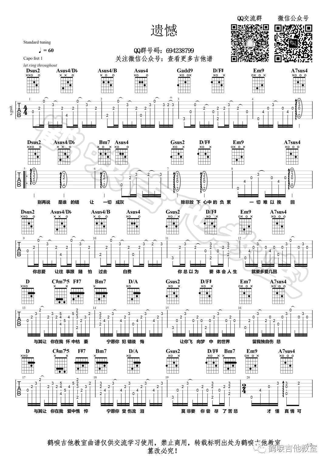 曲谱介绍: 《遗憾》吉他谱,陈洁仪演唱,许美静原唱的一首经典情歌。遗憾六线谱,CAPO夹一品,鹤唳吉他教室编配出品,琴谱网上传更新。