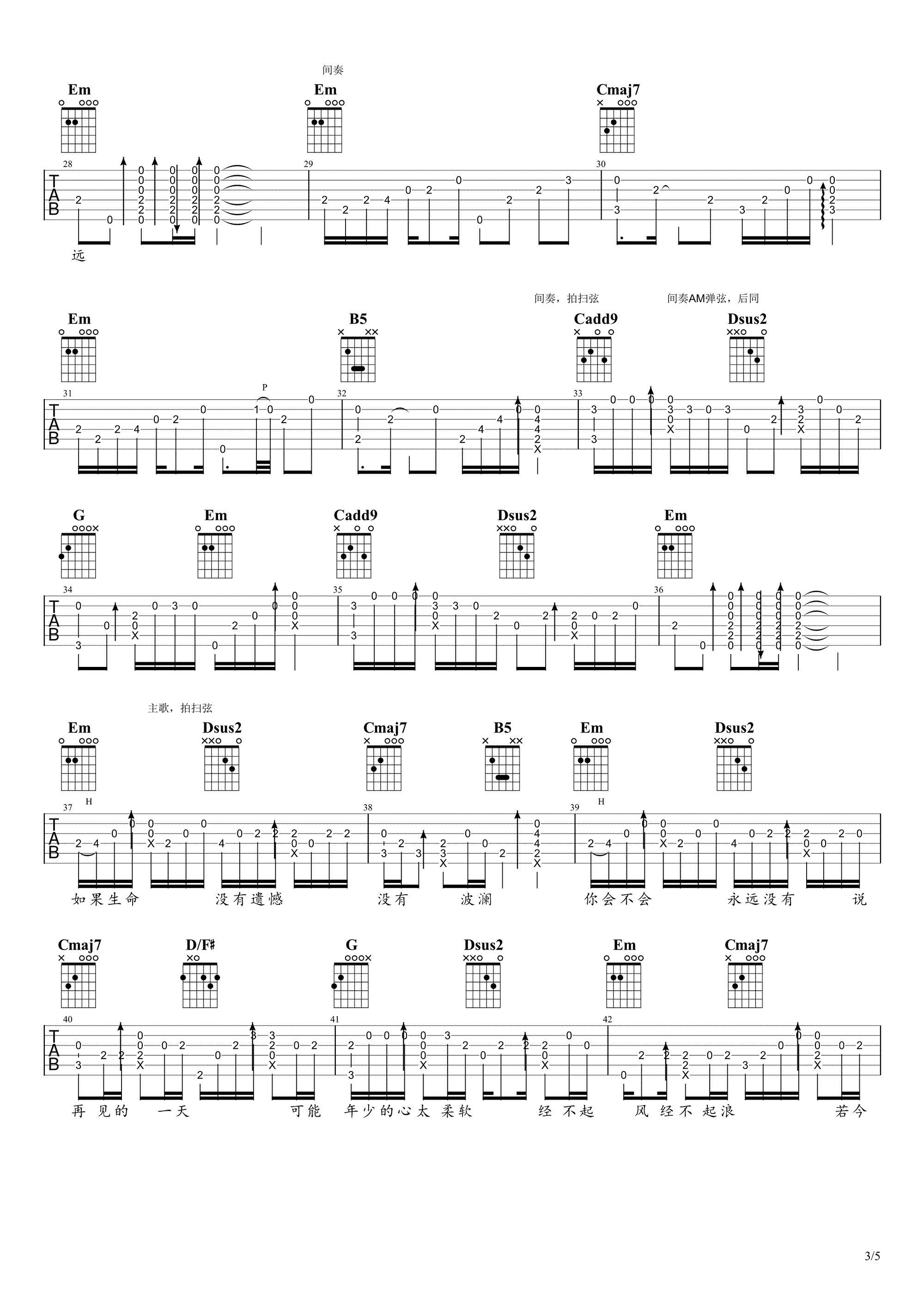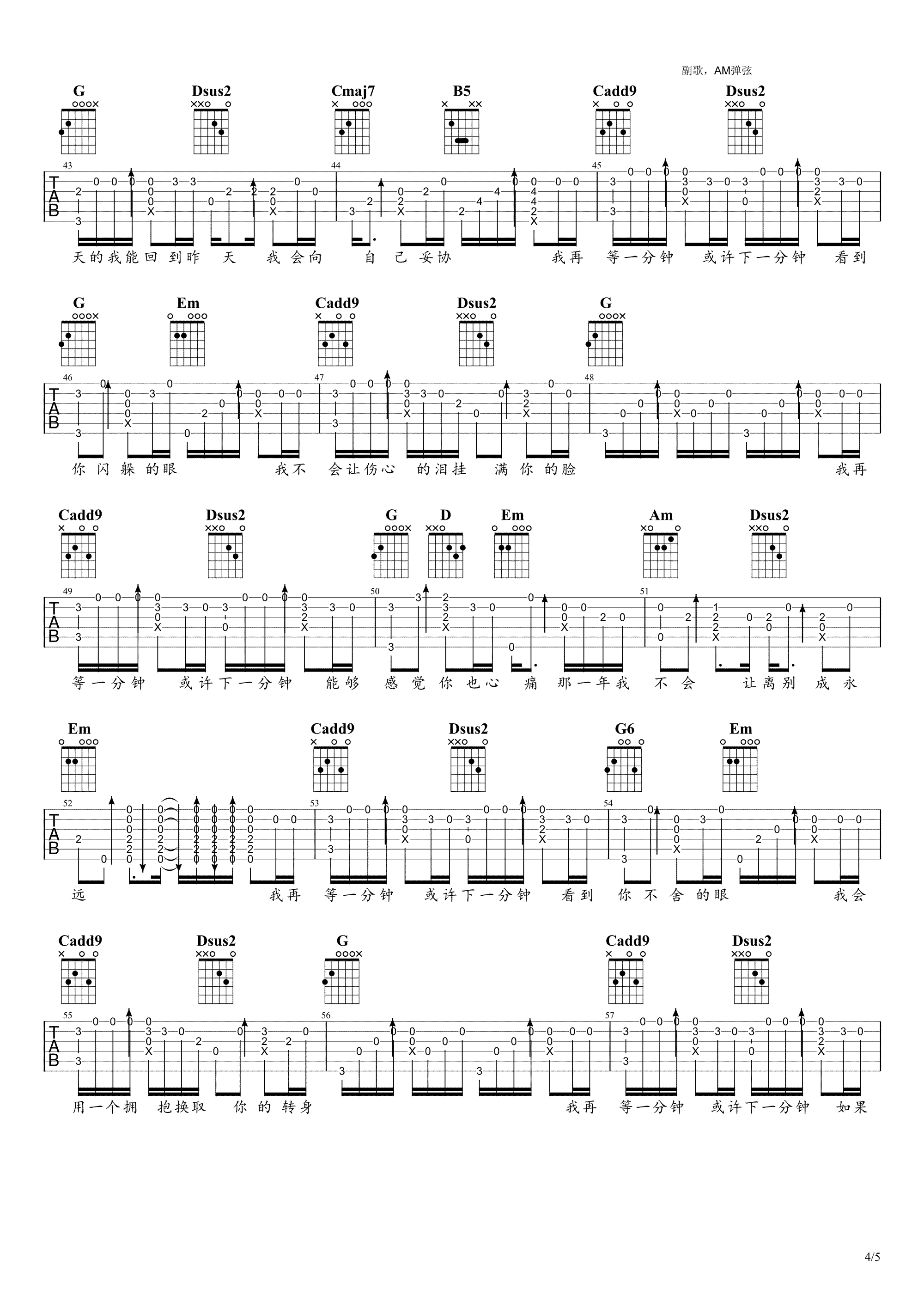 曲谱介绍: 《等一分钟》吉他指弹谱,徐誉滕的一首代表歌曲改编,等一分钟吉他独奏谱,完整版共五张图片谱。钟的吉他分享社出品,并同步分享指弹演奏视频,琴谱网整理上传。 钟亚老师演奏说明:原调,升F调,我用的G调和弦指法编配的,变调夹加2品,实际弹得是A调。 主歌用了拍扫弦,副歌用了AM弹弦技巧,间奏也很认真地编了。整首曲子,放慢了速度弹,感觉好听一点。