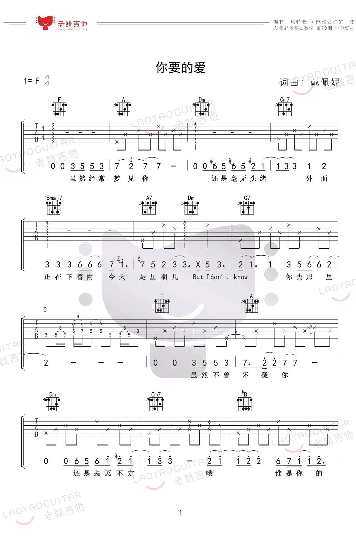 曲谱介绍: 《你要的爱》吉他谱,戴佩妮创作演唱的一首代表作品,也是偶像剧《流星花园》片尾曲。你要的爱吉他六线谱,F调,弹唱谱共两张图片谱例,感谢老姚吉他编配出品,琴谱网更新上传。 想必80、90后的小伙伴都熟悉的经典偶像剧主题曲,今天送上改编,作为从零起步基础教学之F调练习歌曲,随谱附上吉他弹唱教学,喜欢这首经典老歌的琴友们可以跟随示范演示视频练习起来。