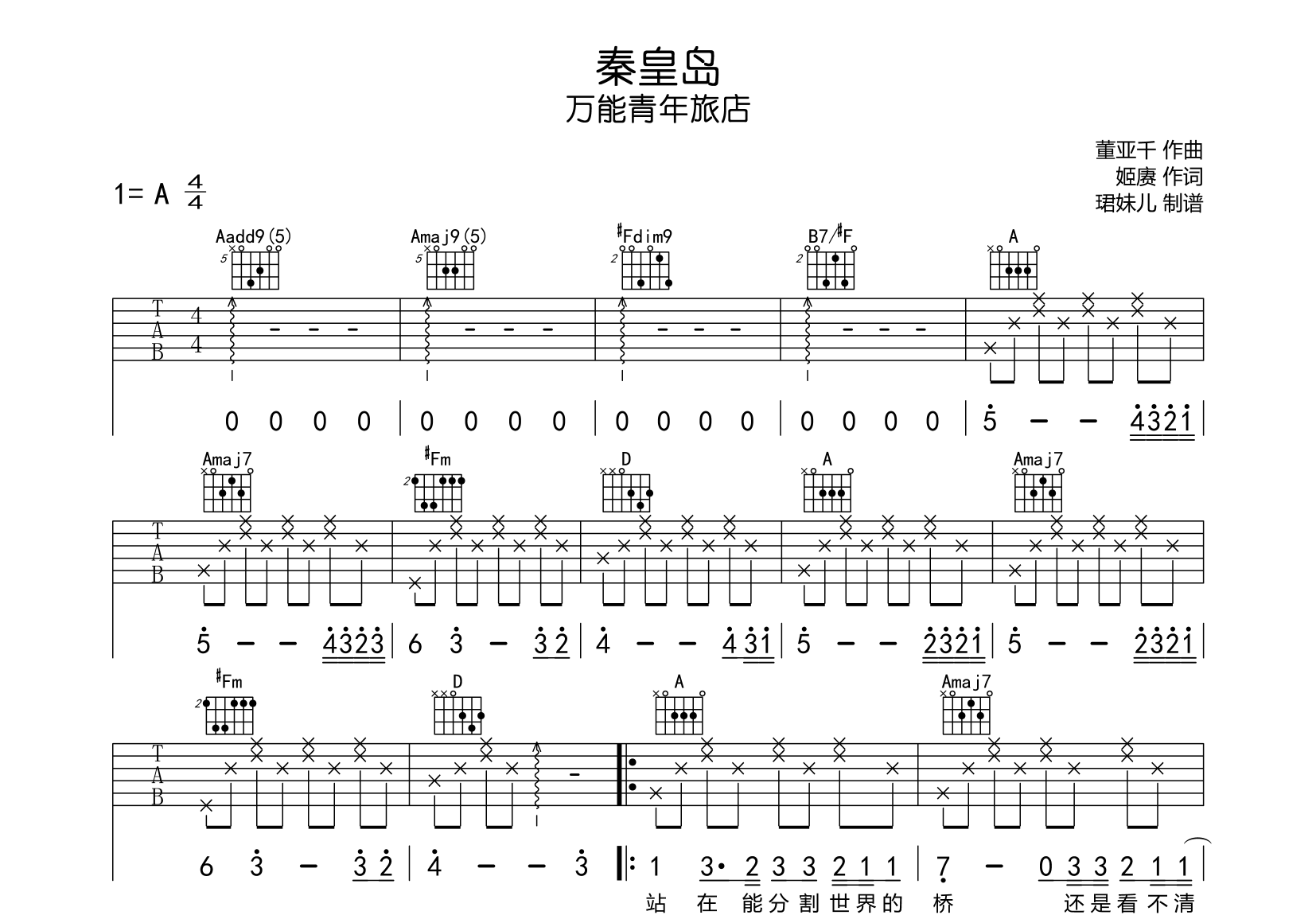 曲谱介绍: 秦皇岛吉他谱_万年青年旅店_A调六线谱,共有两张高清六线谱,本谱采用A调指法编配,速度85BPM,节奏4/4拍,难度较简单,易上手本谱由@珺妹儿制谱上传。