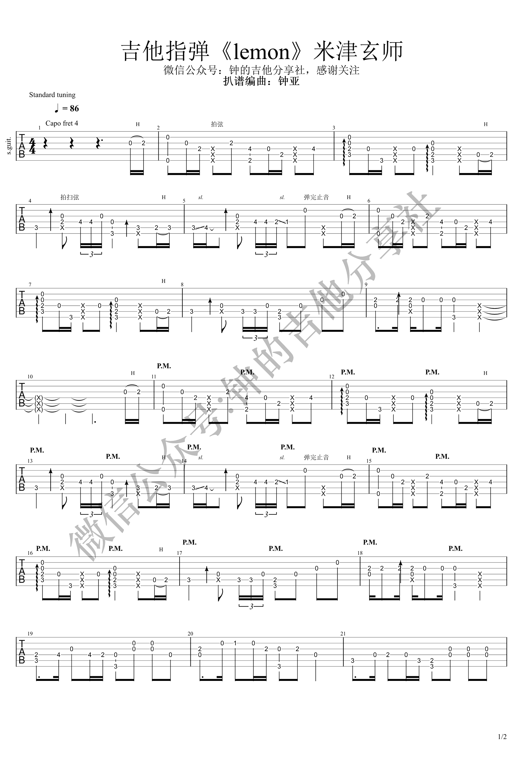 曲谱介绍: Lemon指弹谱,米津玄师经典代表作品,日剧《非自然死亡》主题曲改编,Lemon吉他独奏谱,钟的吉他分享社编配出品,琴谱网整理上传。随谱附上配套指弹演奏视频,琴友们参照示范演示练习。 钟亚老师:原调B调,变调夹加4品,用G调指法编配的, G调和弦:G-Am-Bm-C-D-Em-Fdim(或D7),和弦走向:6-4-5-1用G调和弦弹就是:Em-C-D-G,我就立马想到了《平凡之路》和弦:Em-C-G-D 6-4-1-5,原来换个位置也很好听。 很多人看不懂谱子上的叉号是啥意思,有三个×的是大拇指单独拍弦,叉号有数字的说明要拍扫弦,叉号带PM的要打底鼓。