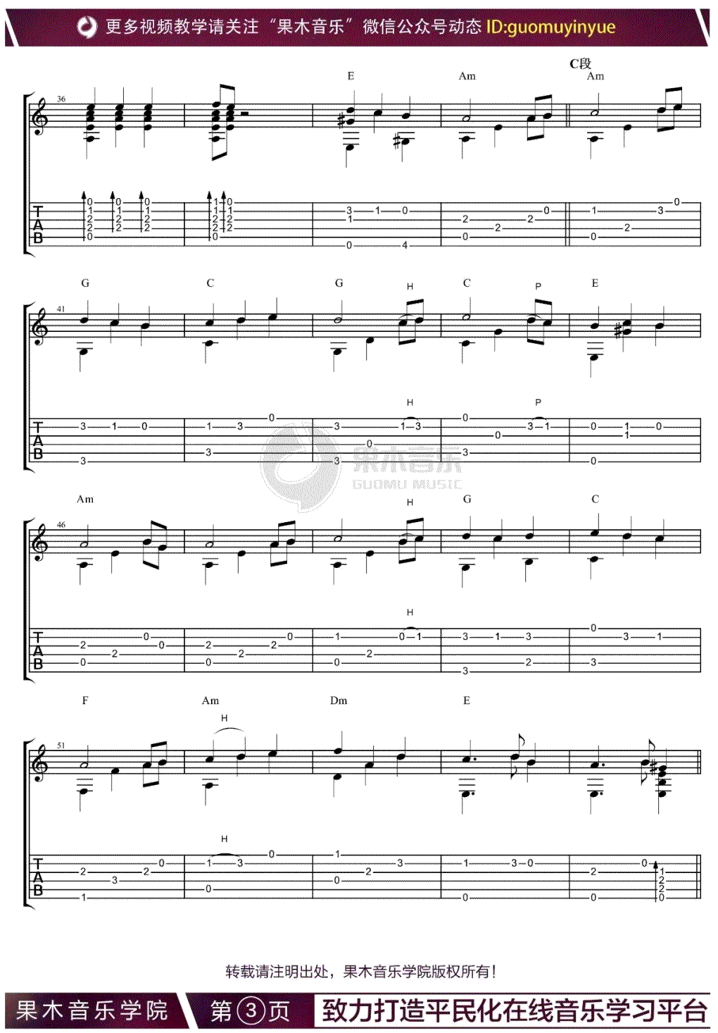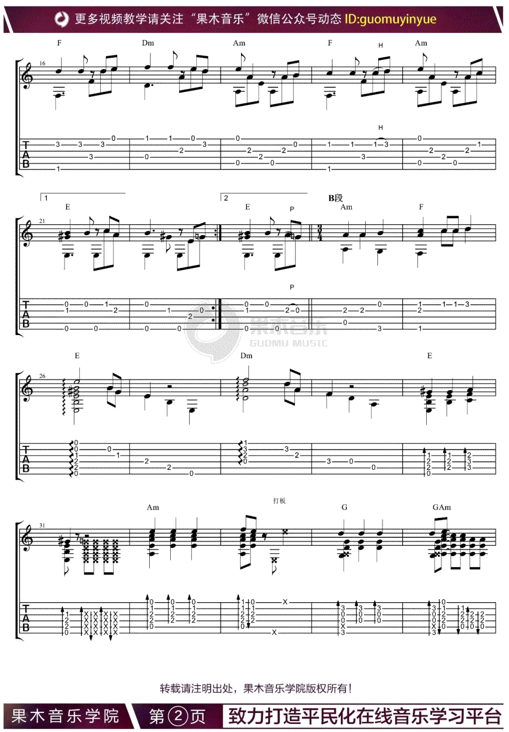 曲谱介绍: 加勒比海盗指弹谱,同名电影《加勒比海盗》主题曲,He is a pirates吉他独奏谱,完整版共四张图片谱,感谢果木音乐苏新程改编,随谱附上配套指弹吉他教学视频,琴谱网上传更新。 加勒比海盗的主题音乐随电影推出之后十几年来经久不衰。一直被各种乐器、乐队改编演奏。主题音乐He is a pirates是最受欢迎的旋律之一。乐曲随着主和弦铿锵有力地敲击,表现船长一往无前的特质。主旋律鲜明而富有号召力,简单直白但极具气势的的和声奏出勇往直前的气势。乐曲中间段落有一段典型的爱尔兰风笛舞曲的旋律,其灵巧的装饰音风格将整个音乐画面点缀得更加华丽多彩。