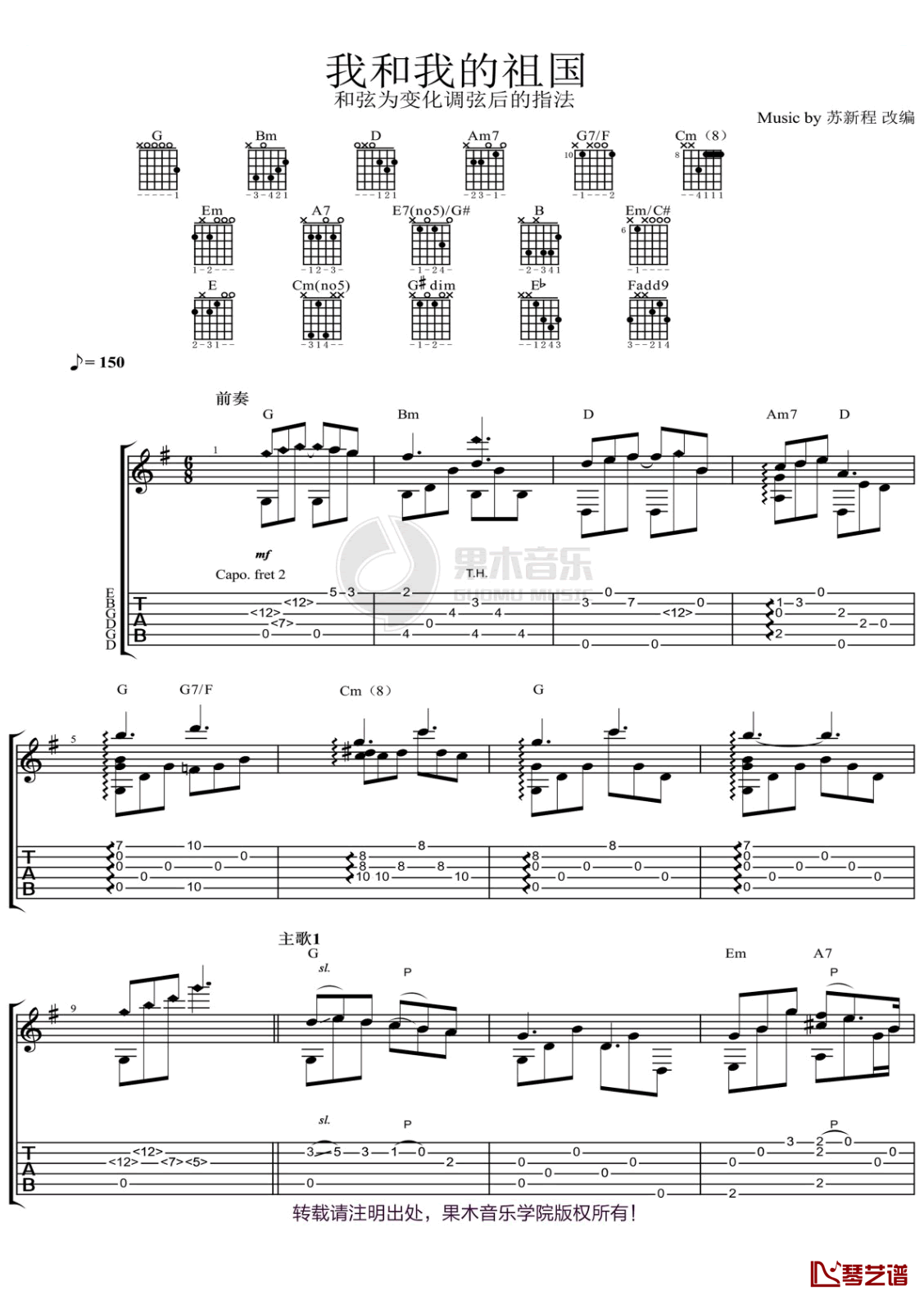 曲谱介绍: 我和我的祖国吉他谱指弹版,苏新程老师根据李谷一的经典红歌改编,我和我的祖国吉他独奏谱,和弦为变化调弦后的指法,弹奏时候变调夹夹2品。让我们在优美动听的琴声里,送上对伟大祖国的赞美与祝福。感谢果木音乐出品,琴谱网整理分享。