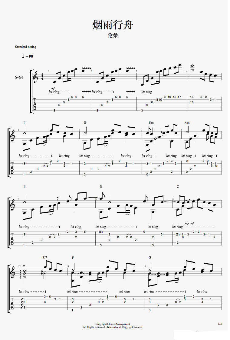 烟雨行舟吉他谱 - 伦桑 - C调吉他独奏谱
