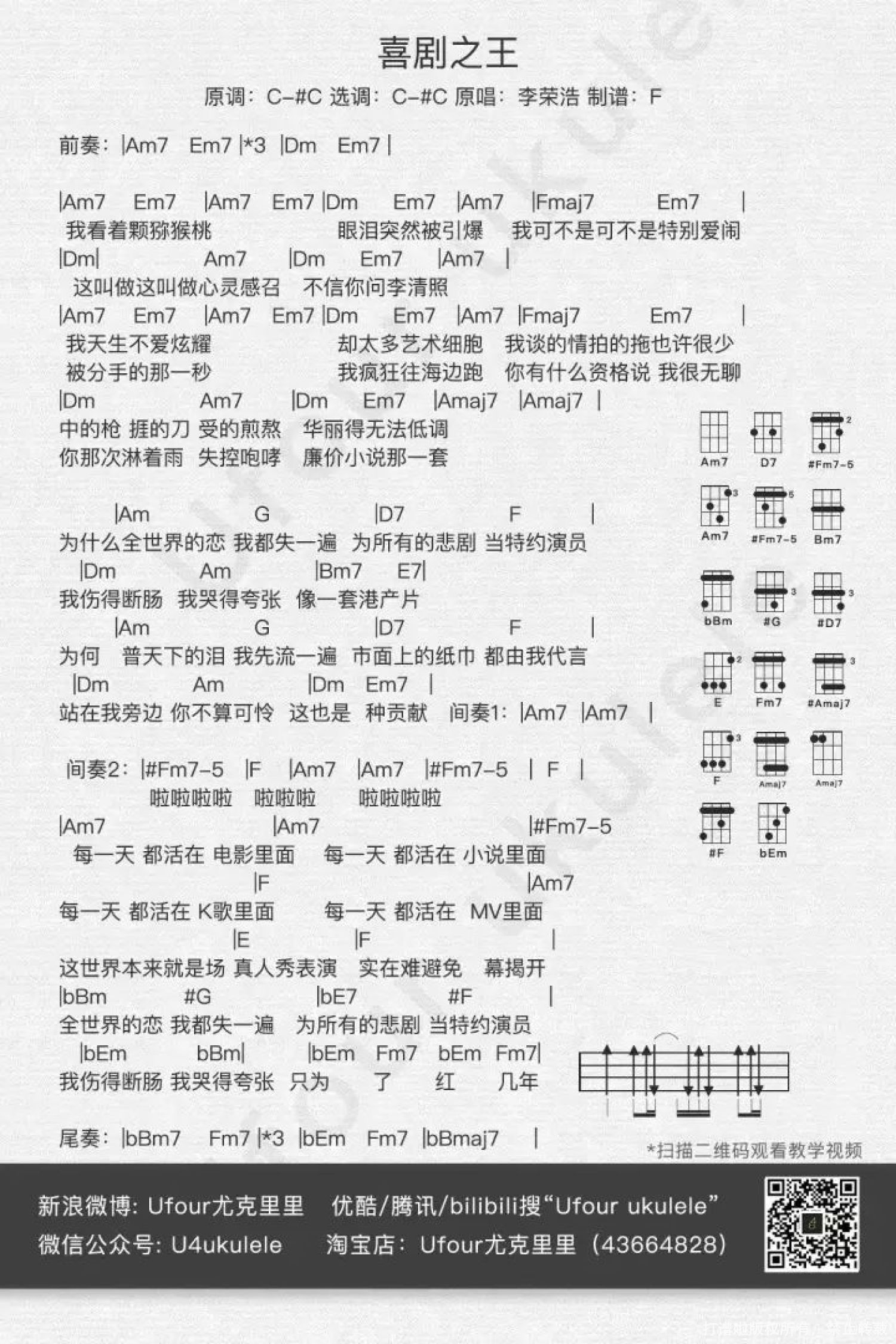 曲谱介绍: Aloha,大家好我是f~新一期的弹唱教学出炉啦,看到标题的空耳就知道我要出的曲子是李荣浩的《喜剧之王》。 不知道为什么,最近听这首歌会想起薛之谦,把这首歌的词和他联系在一起,感觉还蛮贴切的。装疯卖傻拼命工作就为了红几年。 回过头来将这首歌,咱们从来就不蹭热点。 这首歌原调是C-#C的,这个key对女生的话还好,男生的话可能就有一点高,所以我的把琴的定弦降半音来弹,这样会稍微舒服一点。 B Tuning:#F B #D #G 常规的定弦:GCEA,减半音即把这是个音调低半音,G>#F、C>B、E>#D、A>G 。 这首歌节奏型依旧是流行歌里面常见的复合节奏,比较难的地方是这首歌Bridge和接下来的升key的副歌这两部的和弦,这里用到的和弦比较难按,大家可以反复看教学视频哦,有细致的讲解这部分的和弦。   尤克里里教学 李荣浩的歌挺适合用ukulele来弹的,大概是因为他的大部分曲子都是用吉他来创作的吧?   喜剧之王 尤克里里谱
