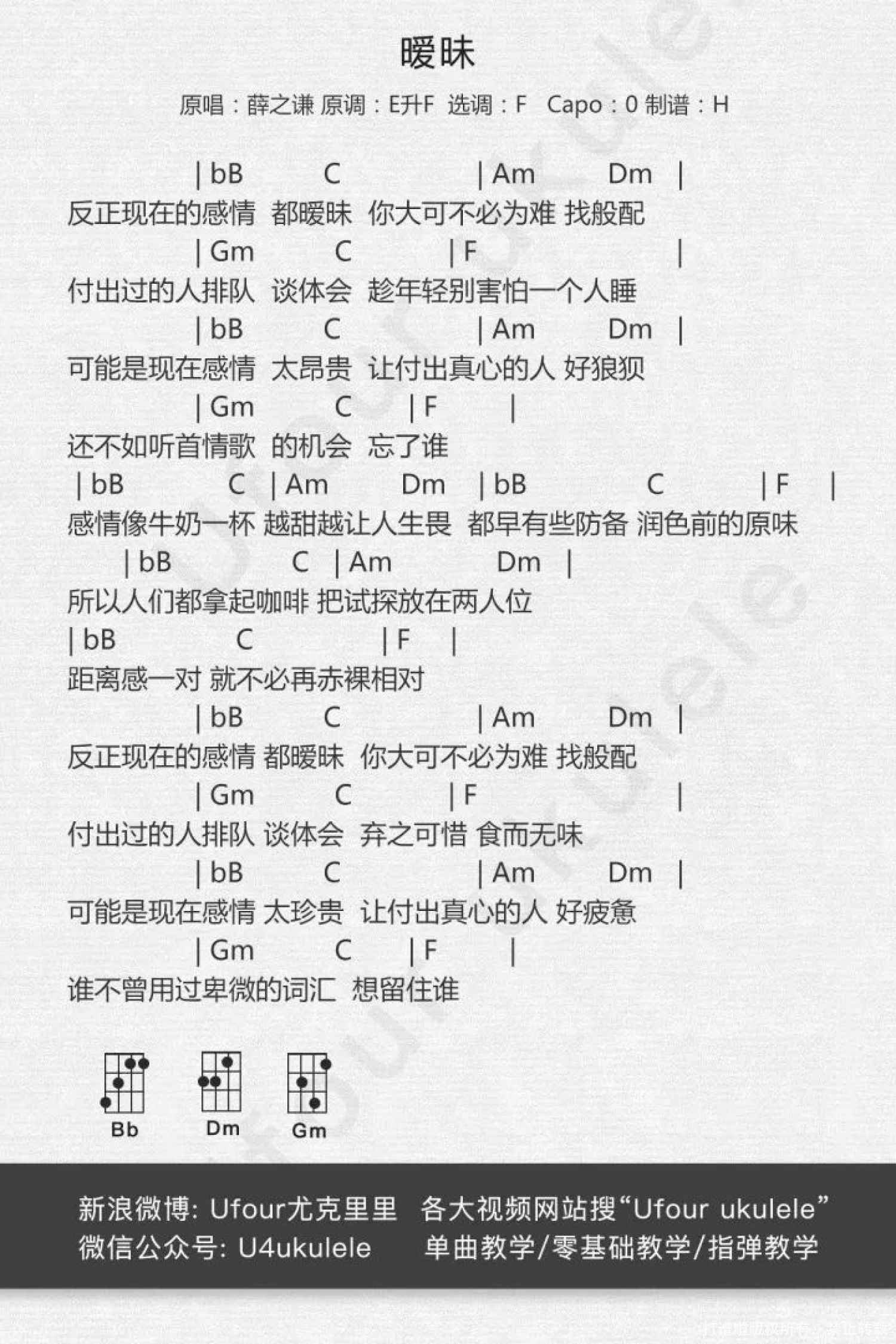 曲谱介绍:     暧昧尤克里里谱 暧昧,像是一种对完美的补充,在脑海里无所畏惧。 其实暧昧本身就是个极其暧昧的词汇,一向很难理解这种味道,却又让无数的男男女女痴恋其中。   暧昧就是没有揭破那层窗纱。 大家互相有好感,这时你心里有ta,却不知道ta心里是否有你,像只兔子一样,前一秒欢腾,后一秒招摇。 暧昧,想往前走多一步却不舍得。 “想往前走多一步却不舍得的时候,是不是暧昧是不是两个人关系最好的时候呢”。你们会走得很近,会一起看电影逛街一起吃饭,会留意到对方不管多么细微的动作和心情。 喜欢是藏不住的,闭上嘴巴,就会从眼神流露出来。 当开始喜欢一个人的时候,思绪如同洪水般,不管嘴上再怎么平静,内心却乱得被头恋爱的小鹿搅得乱七八糟。在你面前像个孩子一样,看见你跟异性交流,会莫名吃醋。 全世界都以为你们在一起了。 怀念学生时代那种对爱情纯粹的八卦,大家都在猜猜哪个男生喜欢哪个女生,哪个女生又跟哪个男生在一起了。内心或多或少会希望大家会误会你和你喜欢的那个人在一起。 谁先认真,谁就输了。 每一个处于暧昧中的人,或多或少会害怕,先开口的人,先失去了一切,害怕被拒绝的自己像个傻瓜一样在等待。害怕他喜欢你,却又好像喜欢着很多人。 不接受,不拒绝,期望和失望的恶性循环。 暧昧大概就是,一个人动了真情,另一个人养了个备胎。你每时每刻都像在恋爱中,又无时不刻不在失恋。既不甘心,又不敢动心。 暧昧是糖,甜蜜又怕蛀牙。 暧昧甜蜜蜜的却不知道何时在心中埋下什么可憎的蛀虫,在最后让自己疼得死去活来。甜食虽好,最后还是要来点主食,暧昧虽好,最后还是要对自己负责的。 “后来,跟你暧昧的那个人去哪里了?” “没去哪,ta在跟我学用ukulele弹《暧昧》呢” “暧昧呀,爱日未日。”