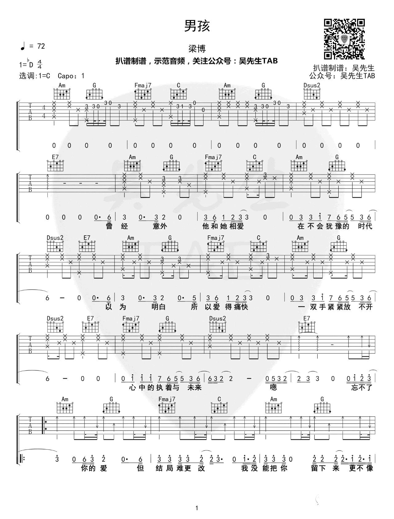 男孩吉他谱 - 梁博 - C调吉他弹唱谱