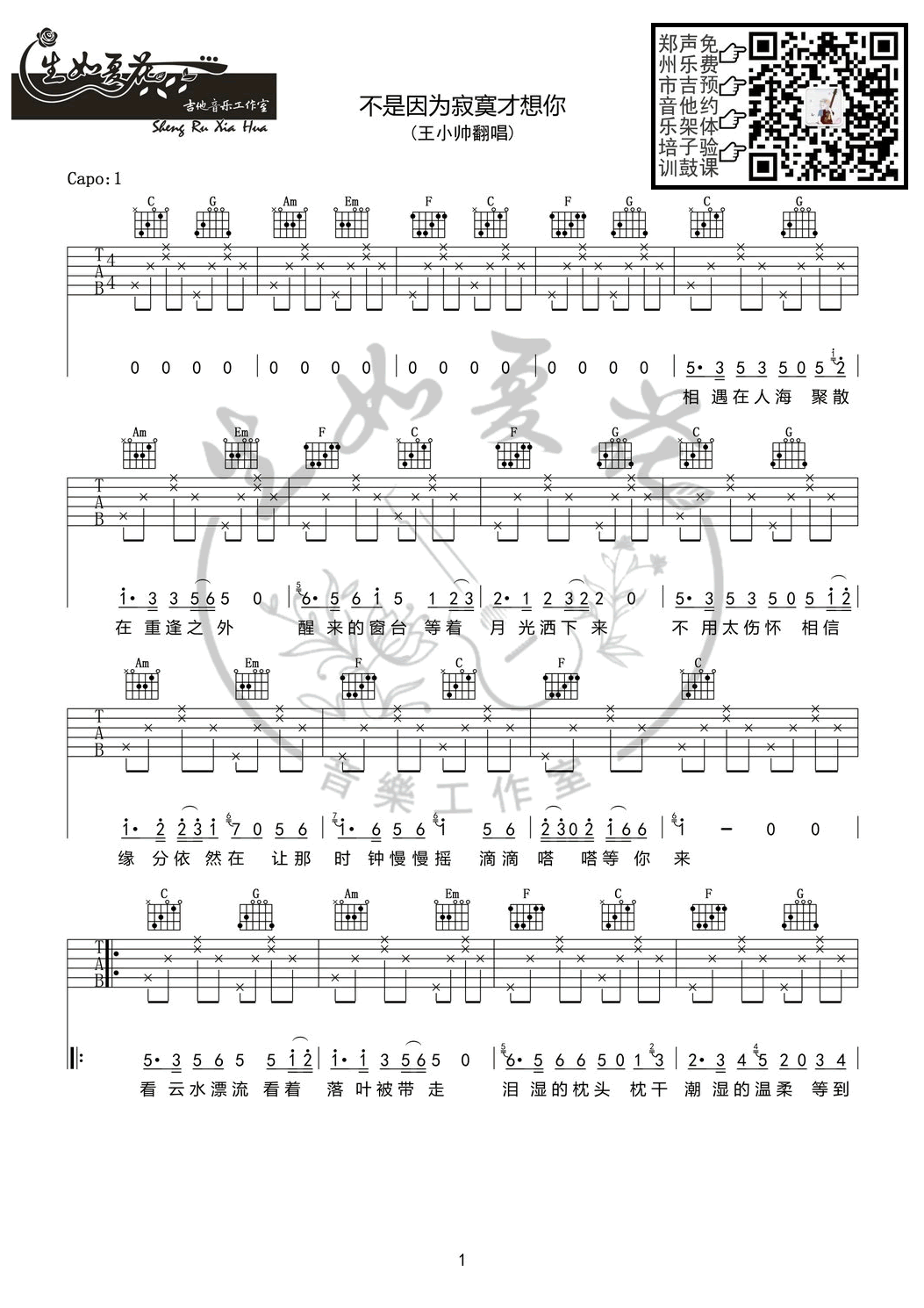不是因为寂寞才想你吉他谱 - 王小帅 - C调吉他弹唱谱