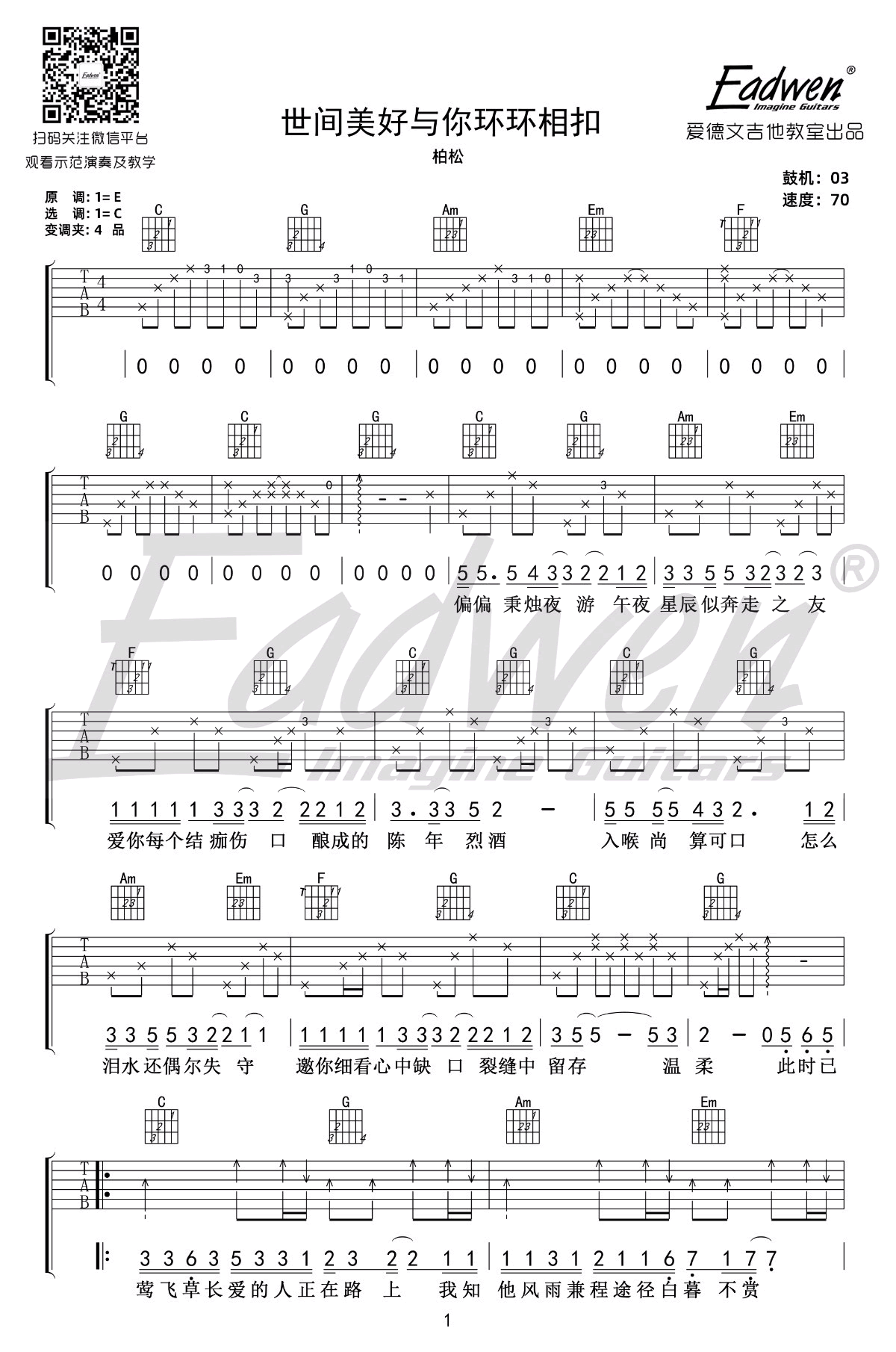 曲谱介绍: 世间美好与你环环相扣吉他谱,柏松演唱,一首网络热门歌曲,世间美好与你环环相扣吉他弹唱谱,原调E选调C,变调夹夹四品。爱德文吉他教室编配出品,随谱附上配套吉他弹唱教学视频,琴谱网更新上传。