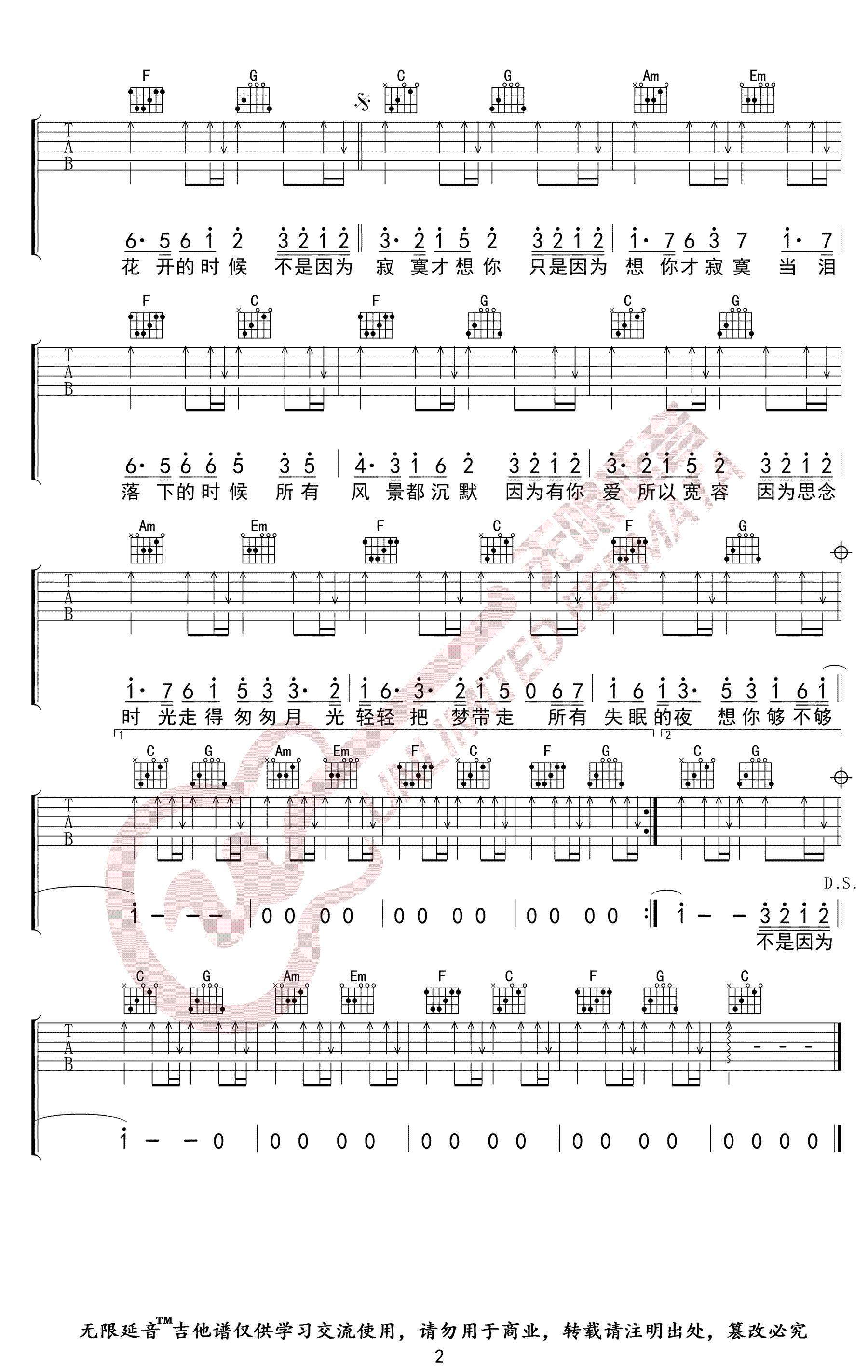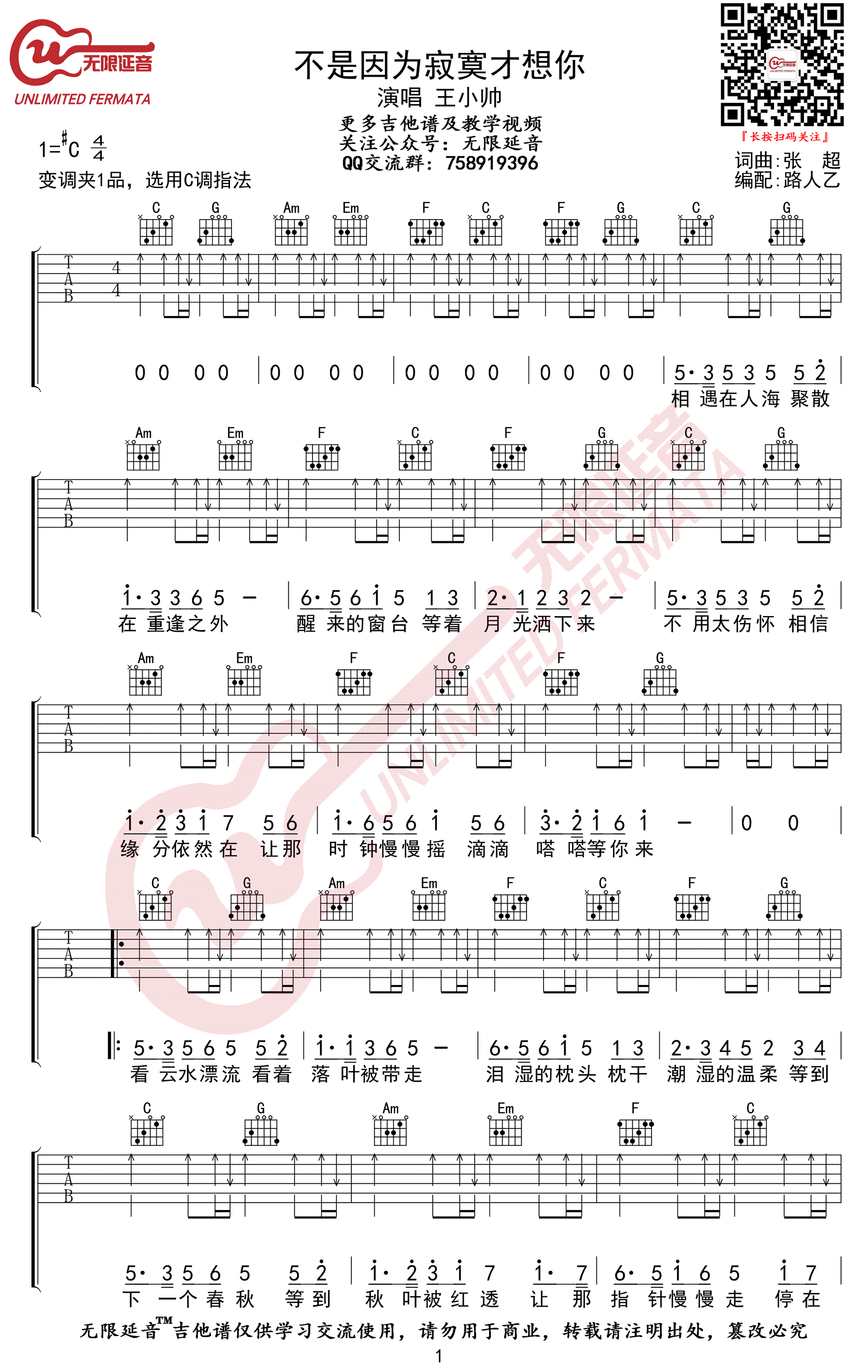 曲谱介绍: 不是因为寂寞才想你吉他谱,王小帅翻唱版本,来自Y.R.Y的经典老歌,不是因为寂寞才想你六线谱,选用C调指法,变调夹夹一品。两张弹唱图片谱。无限延音编配出品,琴谱网整理分享。