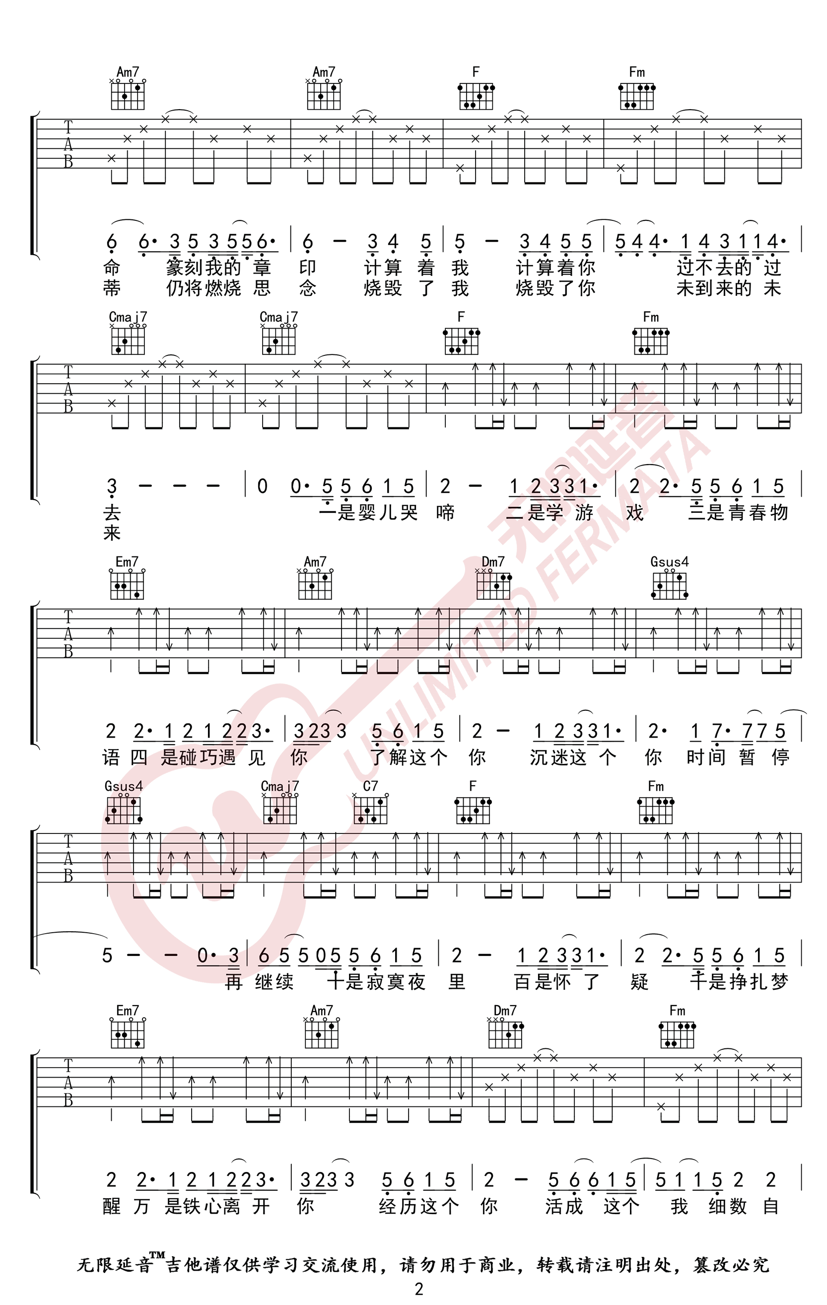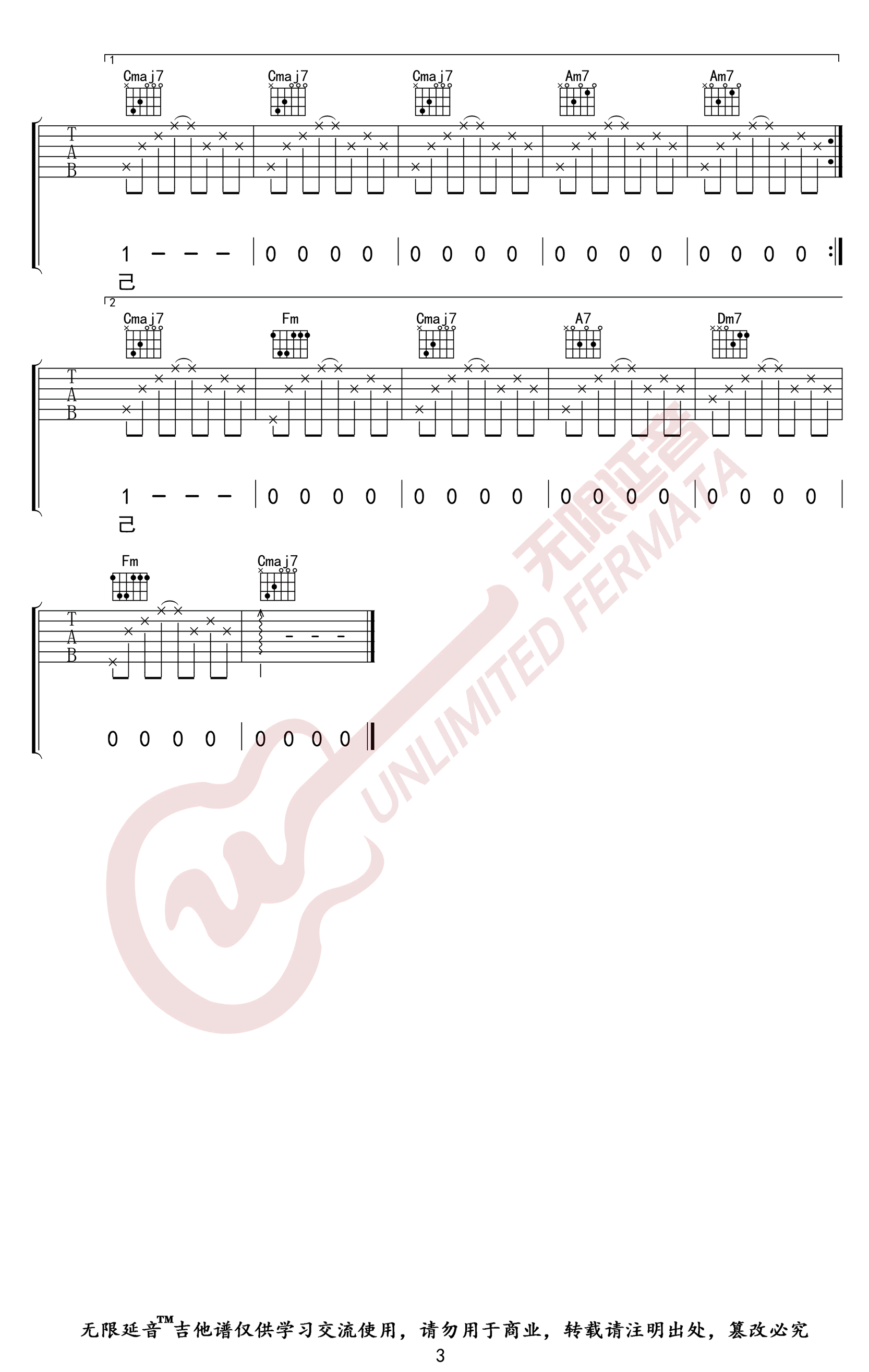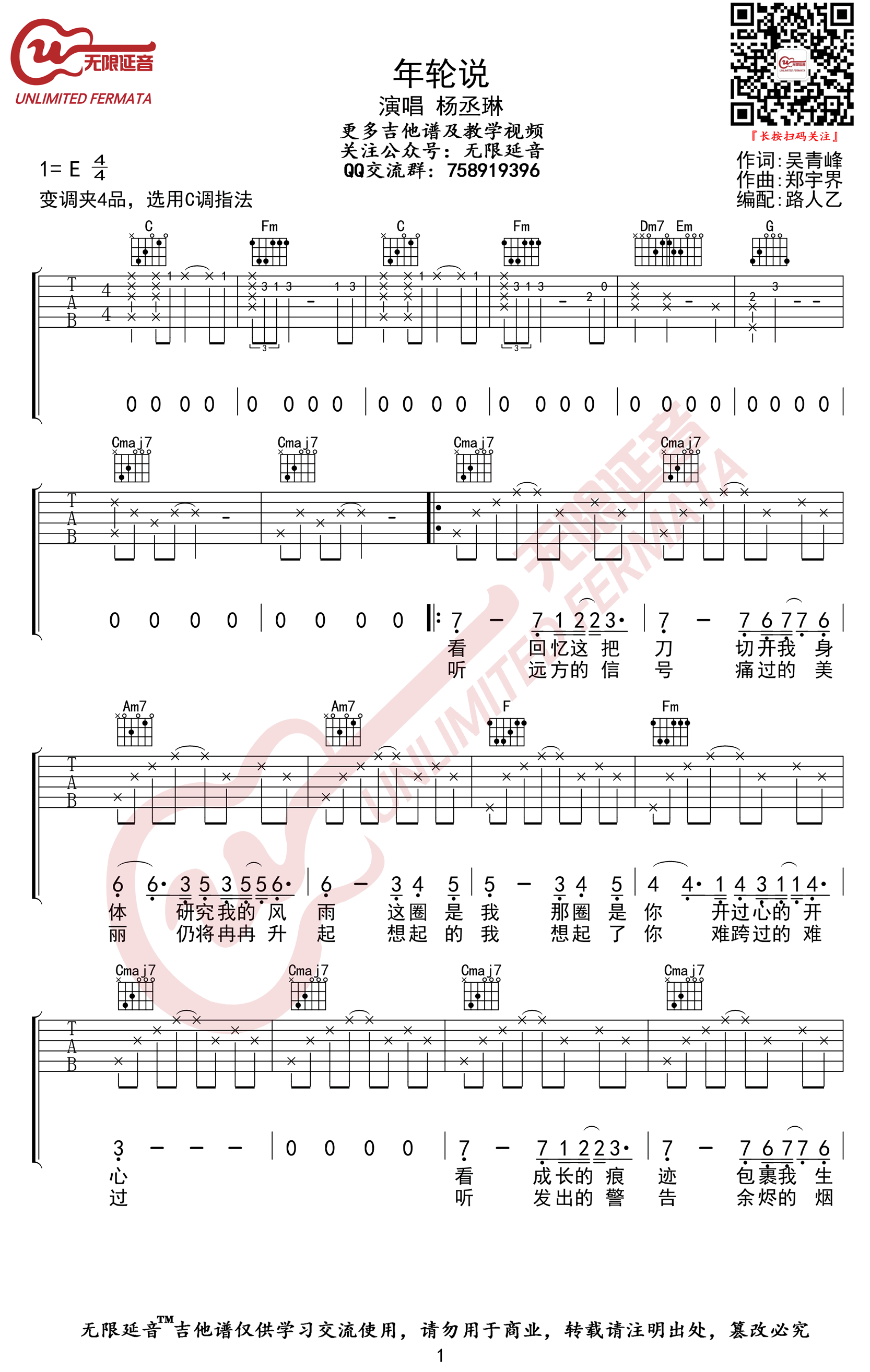 曲谱介绍: 杨丞琳《年轮说》吉他谱,原调E,选用C调指法,变调夹夹四品。年轮说六线谱,三张图片谱高清版,感谢无限延音编配,琴谱网为琴友们整理上传。