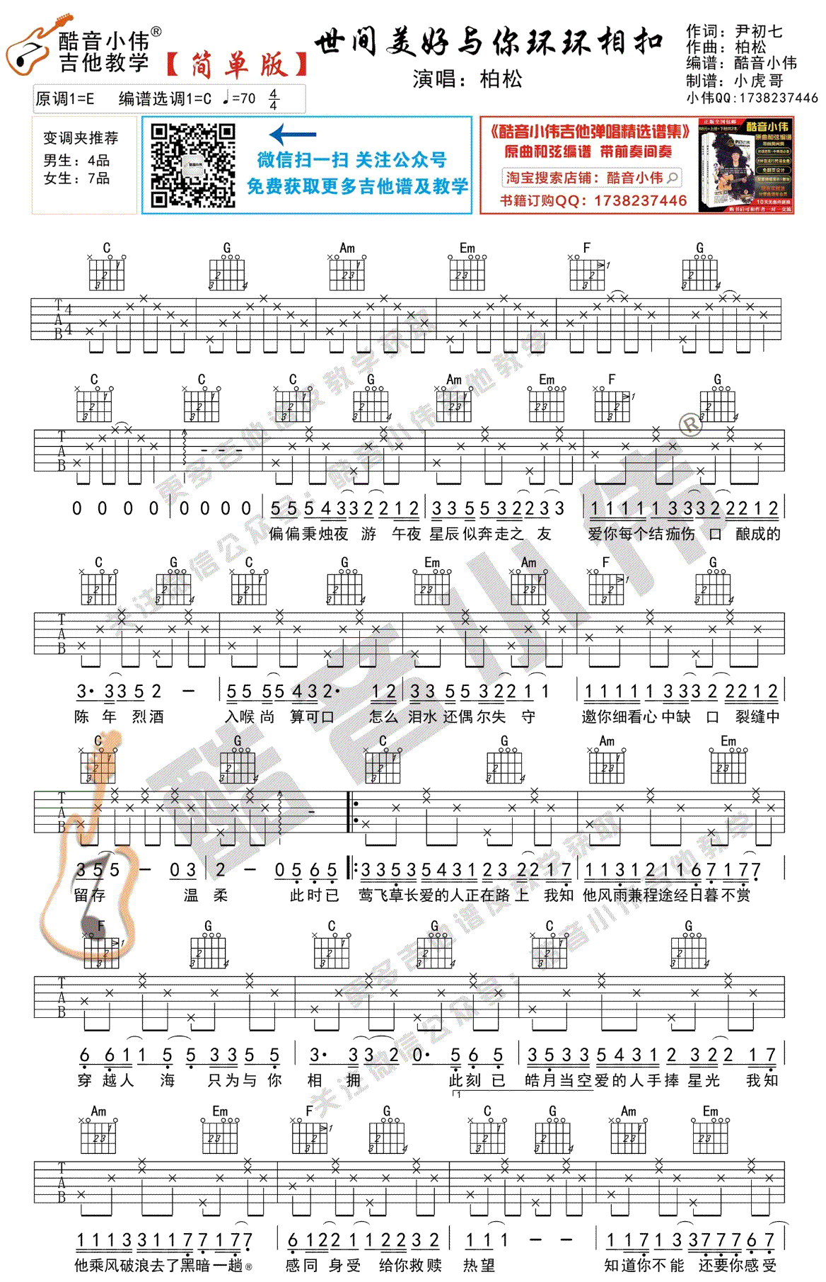 曲谱介绍: 世间美好与你环环相扣吉他谱,柏松的一首热门民谣歌曲,最近火遍网络各大平台。世间美好与你环环相扣吉他弹唱六线谱,原调E,选用D调,变调夹推荐,男生2品,酷音小伟编配版本,琴谱网吉他谱上传分享。 随谱附上曲谱配套的吉他演示和教学视频,同学们可以跟随老师的讲解示范练习。如果觉得中级版有难度,也可以参考为大家准备的吉他谱简单版。曲谱已经放在页面下方。