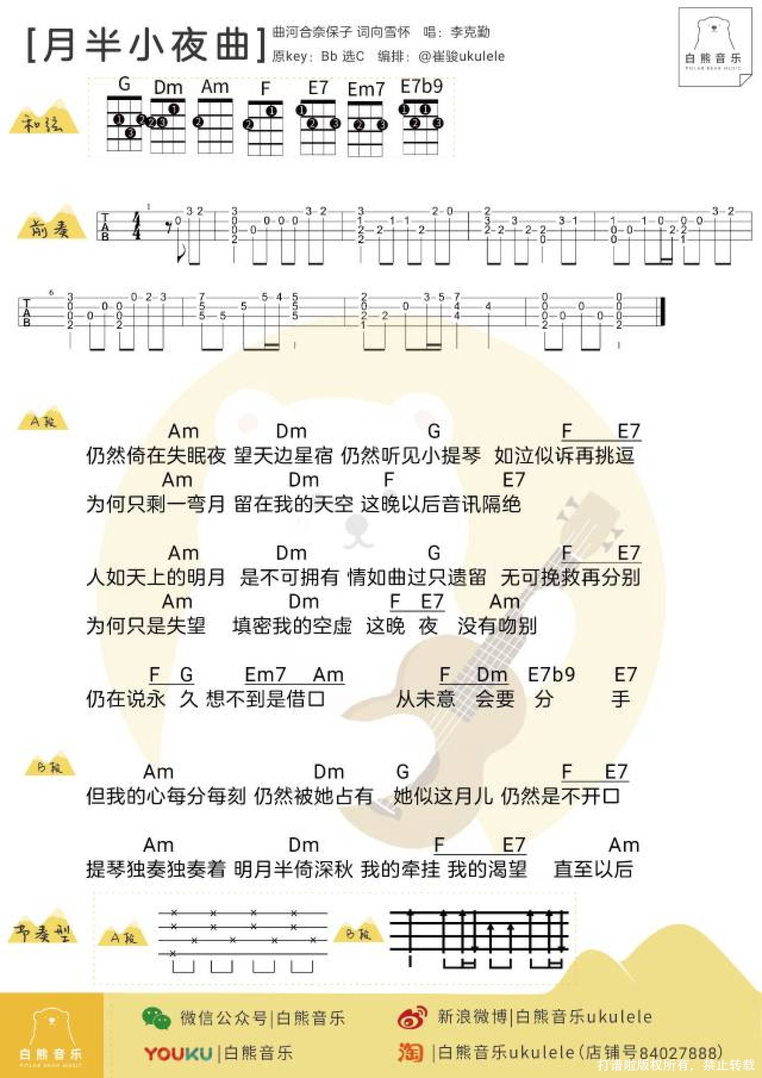 曲谱介绍: 月半小夜曲 尤克里里谱 女生演唱可变调夹夹2品
