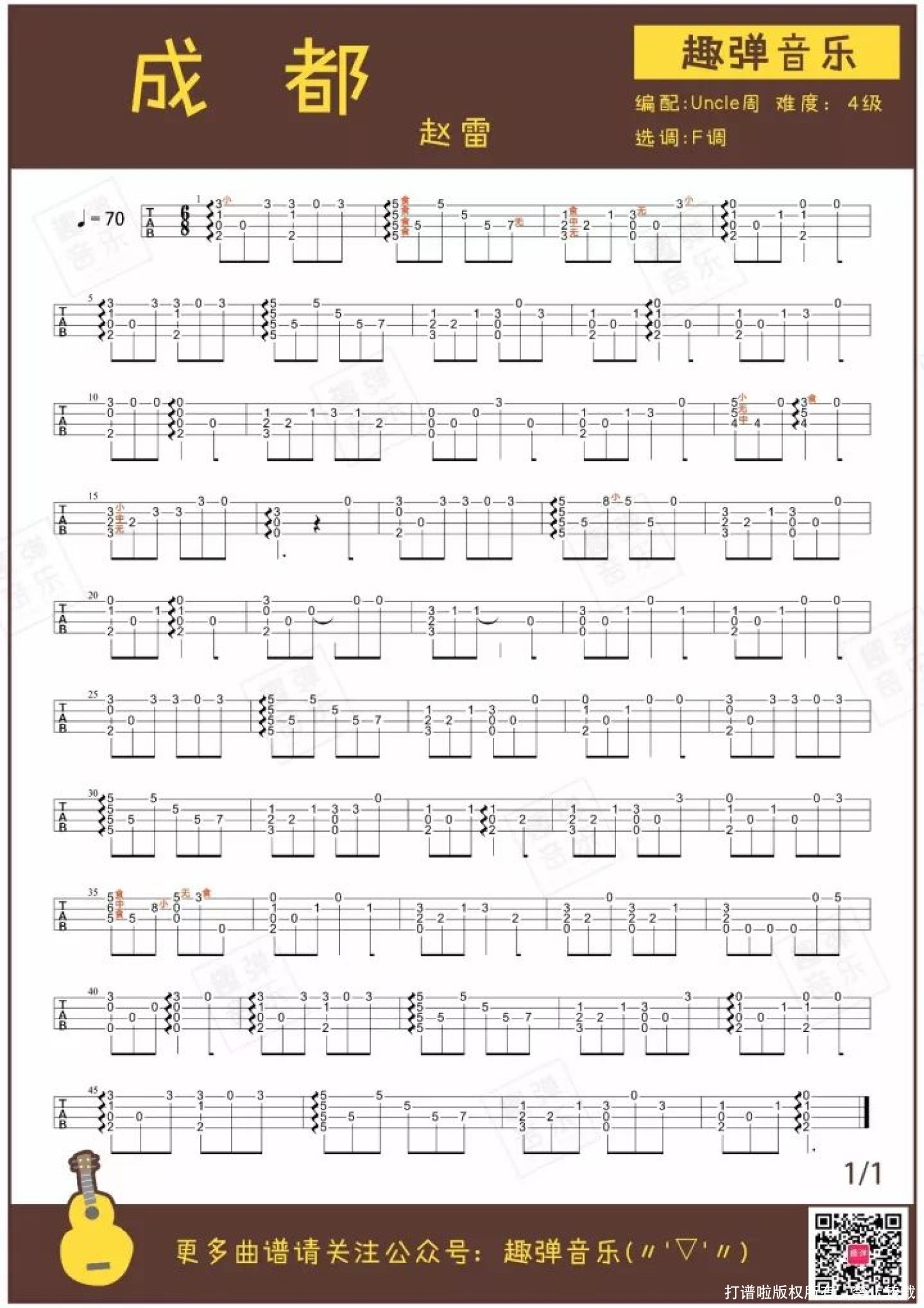 曲谱介绍: 为什么这座城市这么让人留恋?学了这首歌你就知道~   一座让人留恋的城市必不可少的是什么?是美景、美食还是美女? 不论是哪一样,成都都不缺~ 很多人来了成都就不想走,不仅仅因为它有热辣的火锅能满足吃货、有漂亮的小姐姐能满足颜控,更因为这是一座会发生故事的城市。 街头巷尾的小酒馆里,多少人喝着酒想着自己心爱的姑娘? 这座慢节奏的城市里,仿佛永远看不见忙碌疲惫出现在人们的脸上。 麻将一搓就是大半天,火锅一约就没有交不到的朋友,熊猫一卖萌所有人都走不动路。 ※“巴适”,巴蜀方言中是“舒坦”、“安逸”、“非常爽”的意思。 如果你要问为什么成都让这么多人留恋,我不会告诉你太多理由,你学会了这首《成都》就知道~   演示&教学   关于歌曲 ●由赵雷创作词曲,收录于赵雷2016年12月21日发行的专辑《无法长大》。 ●2017年,该歌曲获得第六届阿比鹿音乐奖“最受欢迎民谣单曲奖” 。 2016年之前,这首《成都》只存在在赵雷的现场演唱里,音质不清,还能听见嘈杂人声里听众的四川口音。 2016年底,录音室版本的《成都》发行,勾起无数人对成都的回忆与向往。 这首“送给城市的情歌”,可能是最能唱出成都独特气息与节奏的一首歌。 《成都》的歌词真诚、朴实,每一个人都能代入自己的城市、自己的故事。虽然不是所有人都去过成都,但是每个人对深爱的那座城市的留恋都是一样的。   关于歌手 赵雷说,我是一个必须要唱歌的人。 2003年,17岁的赵雷开始拿起吉他。2014年,一首《成都》让他火了。 他经历过在地下通道唱歌,也曾在酒吧驻场。不论是当年奔波流离还是现在“火到没朋友”,他一直坚持着民谣最精髓的温暖与安然。   弹唱曲谱 附送:指弹曲谱