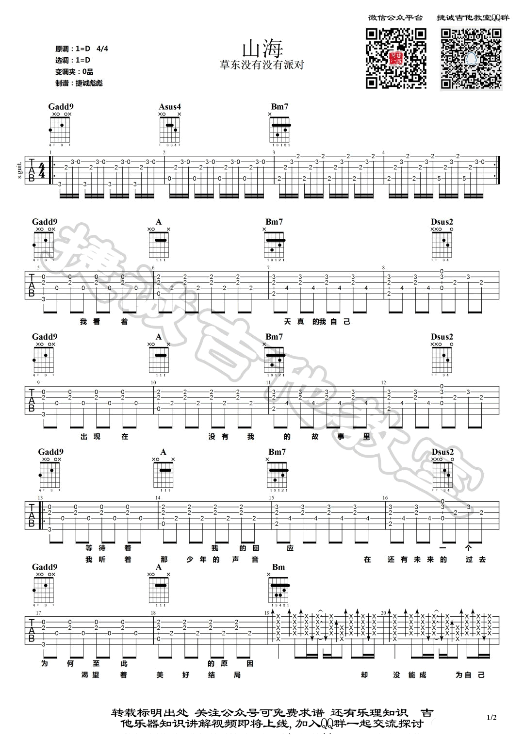 曲谱介绍: 草东没有派对《山海》吉他谱,D调和弦编配,山海六线谱,捷诚吉他教室编配,并提供吉他教学视频,琴友们跟随彪彪老师讲解把握前奏练习。琴谱网更新上传。 歌曲唱出现实理想间的割裂,充满失败者幻灭的愤怒和无可奈何。华晨宇演唱版本,更像是孤独的探索求道者,带着积极抗争的不屈执拗,转身往山海里去成就理想的自己。