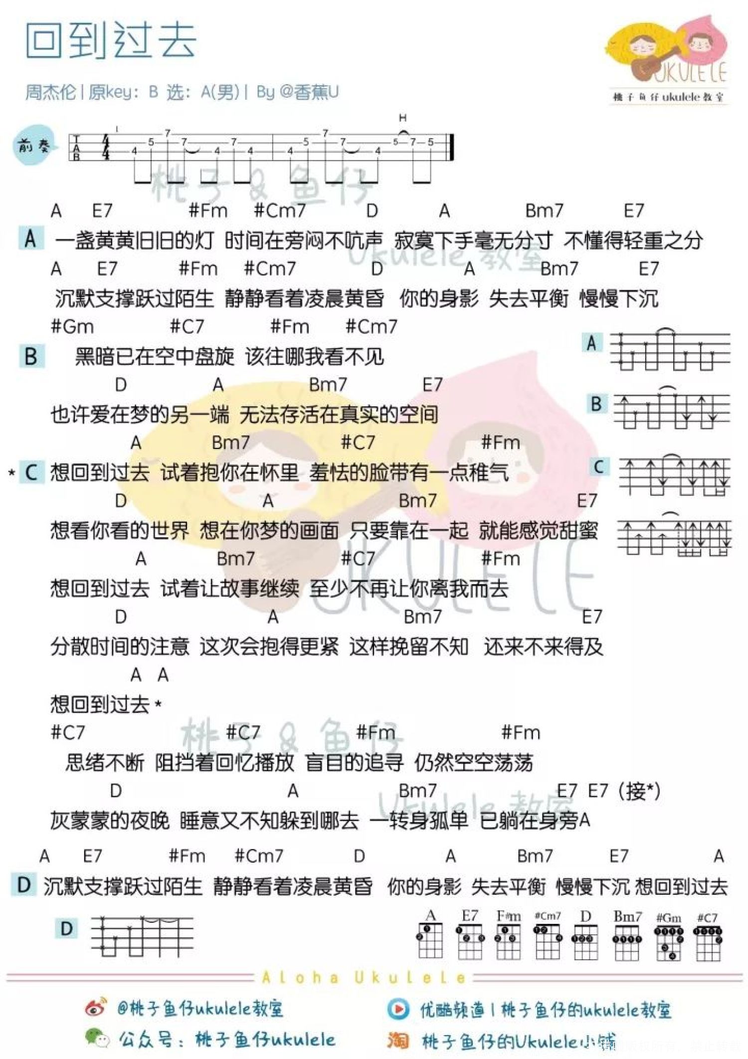曲谱介绍: 关于歌曲 ▌《回到过去》是周杰伦演唱的一首歌曲,由周杰伦作曲,刘畊宏作词,收录于周杰伦2002年发行的个人专辑《八度空间》中。 ▌2003年,该曲获得了2002十大劲歌金曲最受欢迎国语歌曲奖金奖。 ▌《回到过去》是刘畊宏跨刀写词的作品。当时刘畊宏是咻比嘟哗的成员,与周杰伦是同一家公司的艺人,特意为同门师兄弟周杰伦写下这首歌词。刘畊宏写这首歌词是为了表达出在夜深人静时,悼念爱情的孤单感受。周杰伦为了让歌曲在录音上呈现出亮点,在结尾部分采用了模仿老式收音机的特效。 ▌该曲反复使用了拟人化的手法,刻画出夜深人静之时,一个人寂寞地坐在在暗黄的孤灯下回忆那些多么渴望回去,却再也回不去的甜蜜时光时的忧郁心情。“夜”是歌词的主导意象,歌曲是RNB流派,主要伴奏乐器为吉他,整首歌曲没有说唱部分。这首歌透过周杰伦现代感十足的外形,表现出周杰伦骨子里难得的一股恋旧情绪。   歌曲 mv   Aloha Ukulele 尤克里里弹唱cover cover by @香蕉U   教 学 & 曲谱 曲谱 女声版 男声版