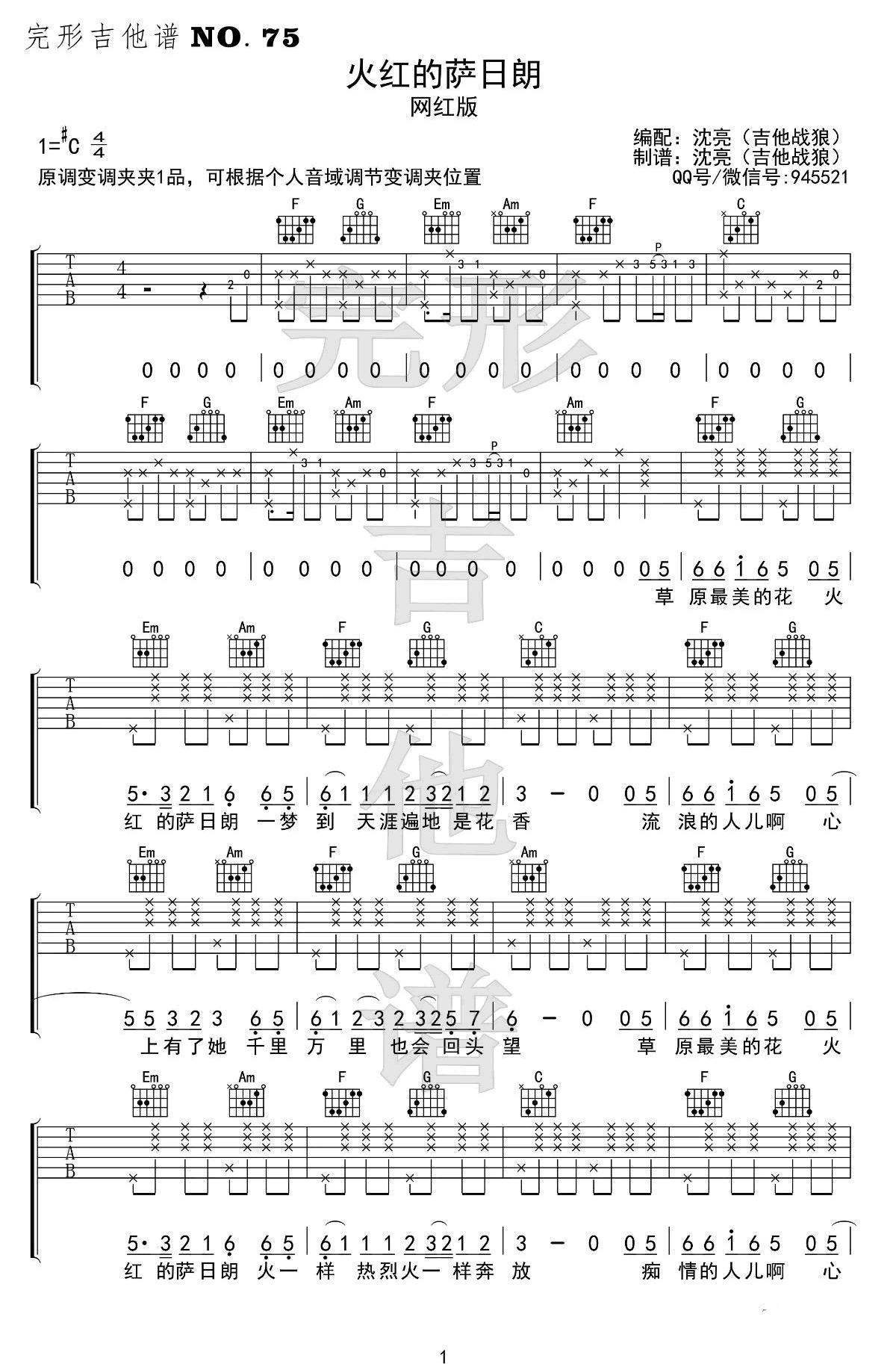 曲谱介绍: 火红的萨日朗吉他谱,要不要买菜翻唱版本,原唱是乌兰托娅,C调指法,变调夹夹一品,琴友可以根据个人音域调整变调夹位置。火红的萨日朗六线谱,完形吉他编配出品,琴谱网整理上传。 收录老师编配的版本和原曲的旋律基本是一样的,完美的诠释了原曲的感觉。和弦的走向非常简单,稍懂一点乐理的朋友都能扒得出来。主要是前奏的指法,大家稍加练习即可。注意节奏的把握。 原曲是114拍,可自行调整速度。鼓机的作用异常强大: 练习时可作为节拍器,使节奏稳定; 增加练习时的趣味性,有加花和过门; 表演时可以增加弹唱元素,让音乐更饱满。