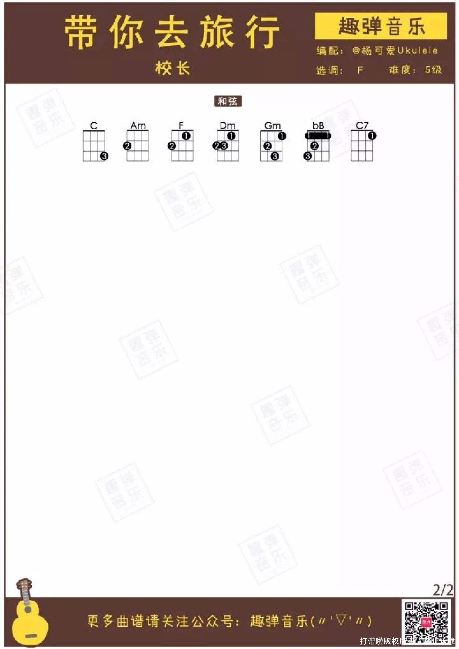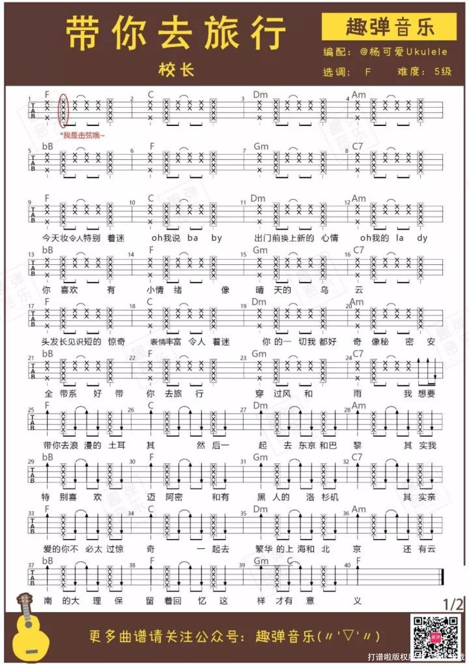曲谱介绍: 国庆长假必弹歌曲,变身老司机,带妹子环游世界! 嗨翻天的八天长假终于开始了!小编已放飞自我,开心到哼小曲! 八天长假不出去玩一圈怎么行?但是又怕景区全是:人人人人人人人人? 不用慌!这首《带你去旅行》有一种魔力,只要学会它,一秒变身旅游界的老司机,没有你撩不到的妹! 还等啥,先让我们可攻可受的杨可爱小姐姐给大家演示一波旅行撩妹大法!   ukulele cover歌曲MV ※ 视频渲染的时候手误,实际总时长2分37秒,后面没有内容 试问你的小哥哥唱歌说要带你环游世界,你能不动心吗~反正我是动心了~ 听着杨可爱唱这首《带你去旅行》,整个人心情好到飞起~MV里用到各种各样的乐器,小伙伴数出来有多少种了吗?   关于歌曲 ● 于2017年8月10日发行的一首单曲,是歌手“校长”的代表作。 ● 歌手“校长”,90后创作型艺人,因歌声在网络上受到欢迎。 《带你去旅行》旋律清新欢快,歌词中充满了男生对女生的宠溺,满满都是甜蜜。 歌词从土耳其东京巴黎唱到洛杉矶,有人掐指一算,这趟旅行要花20多万…… 难道不是土豪就不能环游世界了吗!我不服~快快拿起小U,把这首歌学起来,让琴声带你去旅行~   歌曲教学   弹唱曲谱 愿你在小U的陪伴下 度过一个美好的长假~ 帅的人已经开始 练琴了( • ̀ω•́ )✧