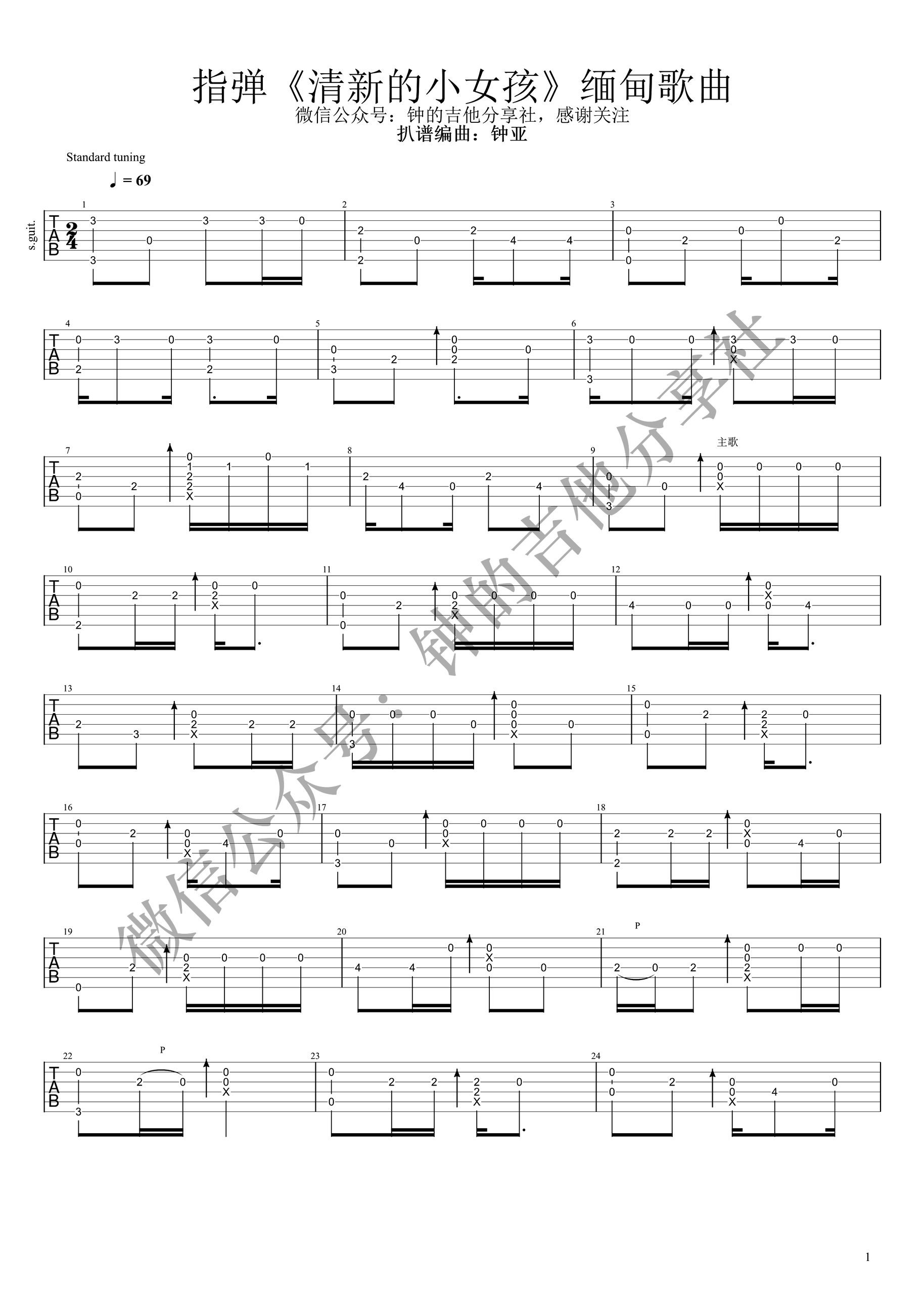 曲谱介绍: 清新的小女孩指弹谱,缅甸歌曲改编,这首洗脑神曲被网友配上《牧马人》这电影火了。清新的小女孩吉他独奏谱,钟的吉他分享社出品,琴谱网整理上传。 钟亚老师编配说明:加了和声,加了拍扫弦,加了一些击勾弦,曲子也弹熟了,录了视频,虽然没那么好听,不过做好一首还是不容易的。 G调的歌曲,G调指法低八度编配,G调各级和弦:G-Am-Bm-C-D-Em-#Fdim,全曲和弦走向:G-Dm-Em-Bm-C-G-Am-D,就别再问谱子为啥没和弦了。
