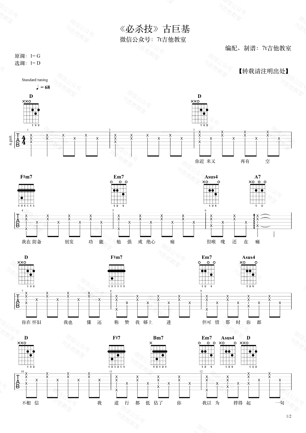 曲谱介绍: 《必杀技》吉他谱,古巨基演唱的一首经典粤语歌曲,必杀技六线谱,原调是G大调,这里采用了D大调的指法来编配,弹唱演示视频里是标准音调弦,没有使用变调夹,适合音域较低的男生~如果想唱原调的琴友,只需使用变调夹夹第5品就可以了哦。7t吉他教室编配出品,琴谱网整理上传。 右手节奏型可以自由发挥,不必完全按照谱子上的来弹,有很多种节奏型都可以把同一首歌弹得很好听。对于吉他初学者来说,如果感觉曲谱上的节奏型很难,可以用最基础的节奏型来代替。