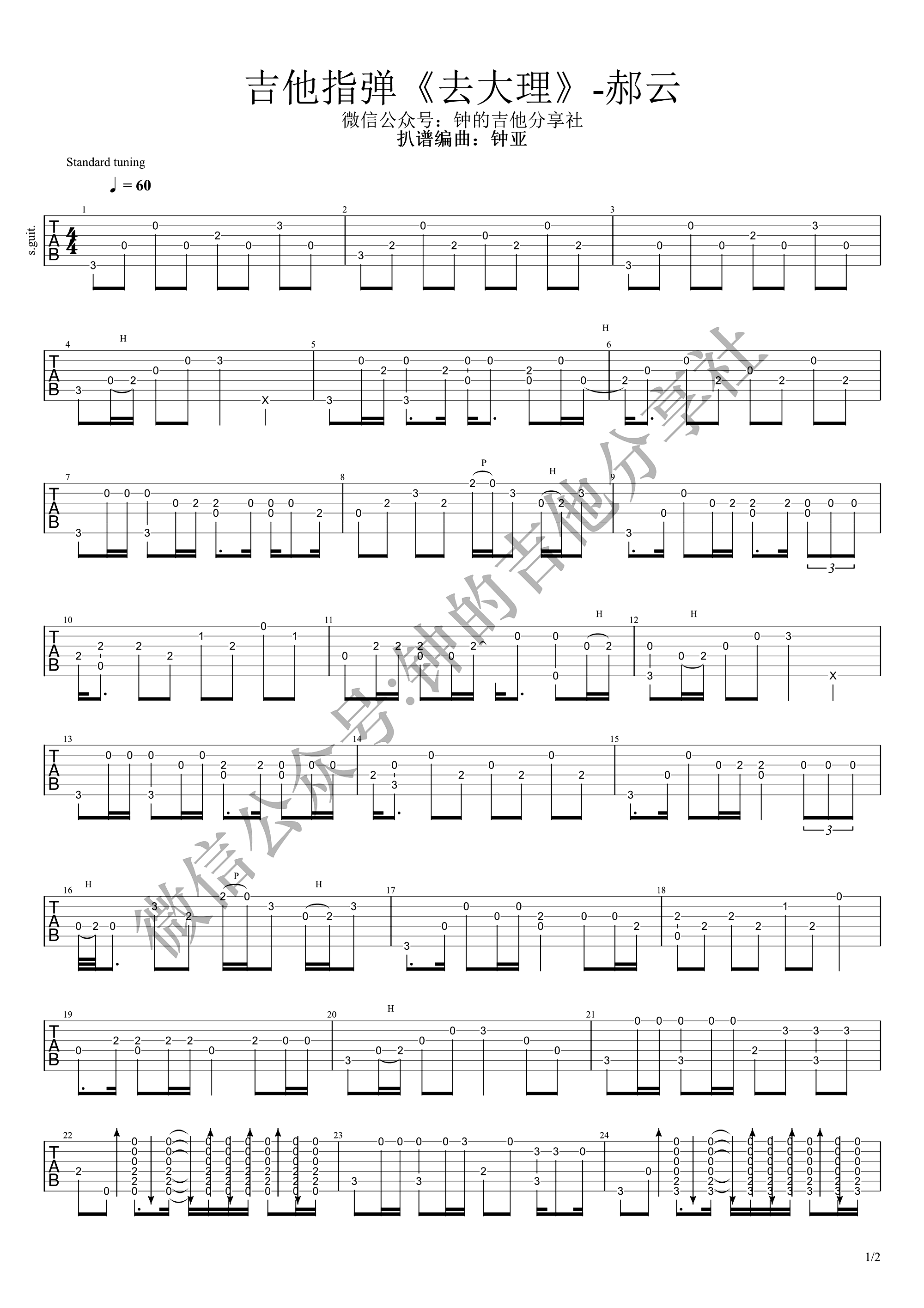 曲谱介绍: 去大理指弹谱,电影《心花路放》主题曲,郝云《去大理》吉他独奏谱,歌曲原调G调,G调指法改编。钟亚编配并带来指弹演奏视频,琴谱网整理上传。
