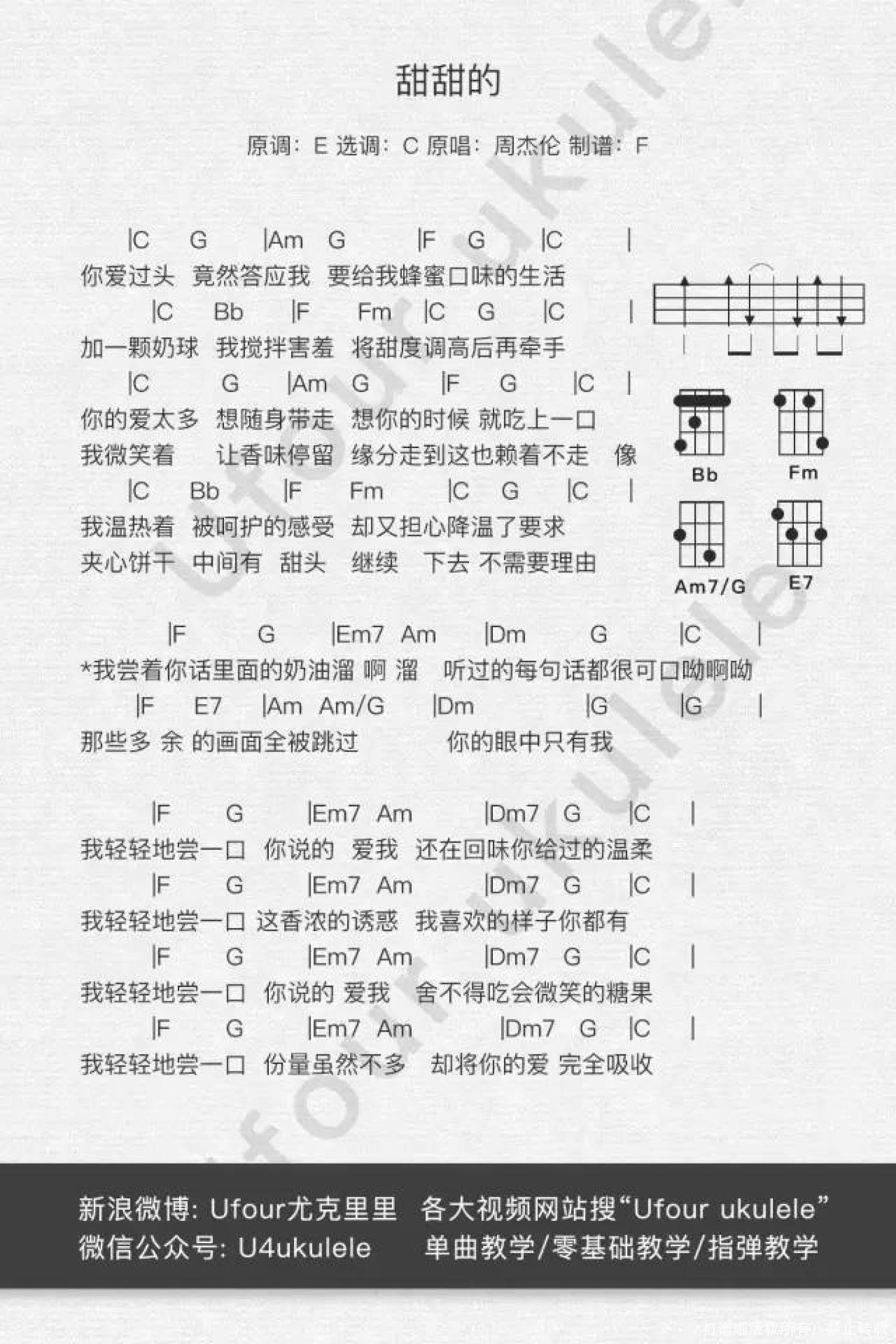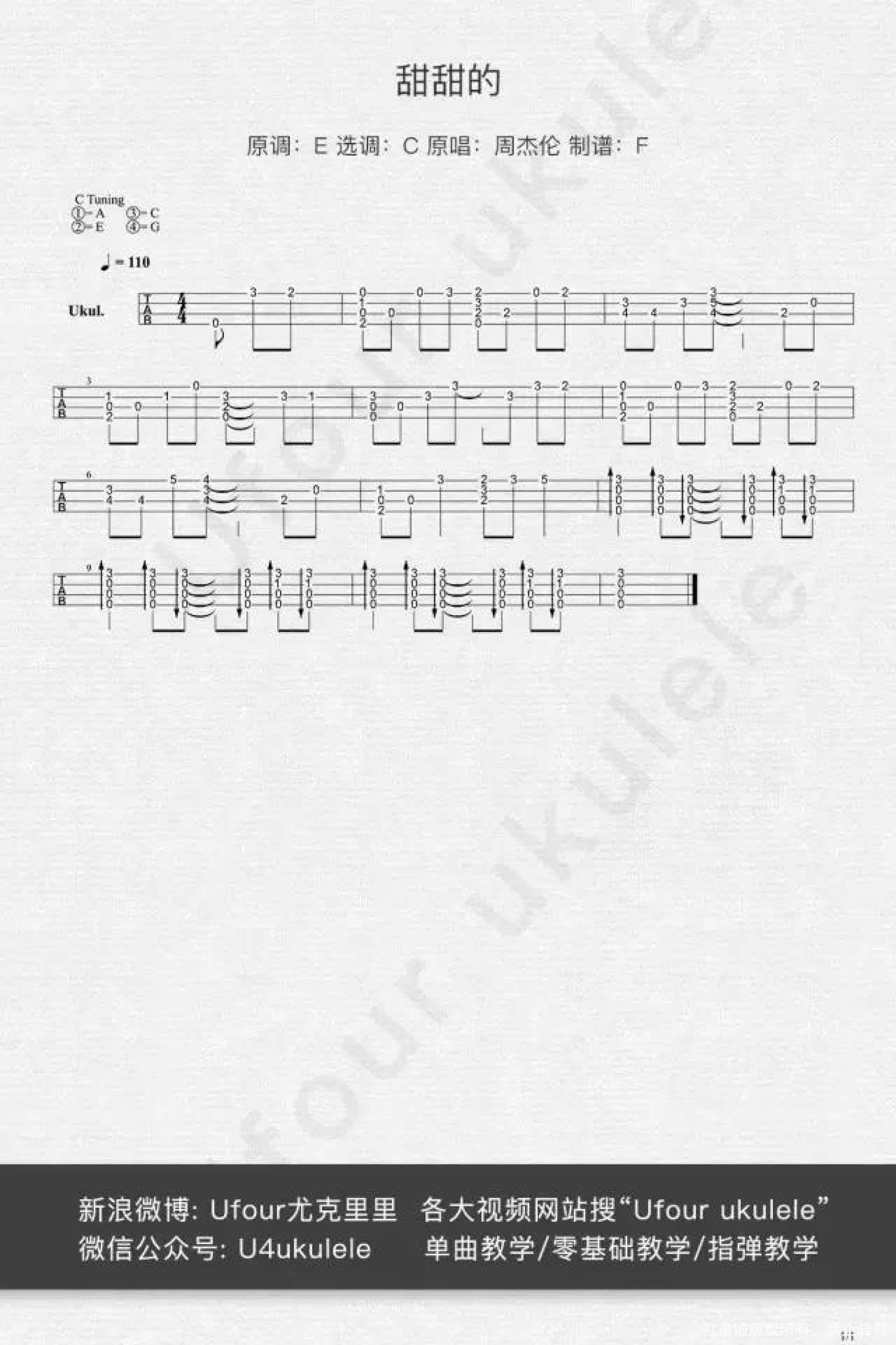 曲谱介绍: 嘿嘿Aloha,大家好,好久没有更新啦,都已经有小胖友在后台催更了。我不是在偷懒哦,最近我都在囤曲子(重感冒),这样接下来的更新就可以稳定更新啦。   之前一直在想,什么样的歌适合ukulele弹,第一反应就是《麦芽糖》这首歌,但是因为我实在驾驭不了这首歌,所以后面选了《甜甜的》这首歌,像这类欢快活泼的曲子最适合ukulele。 前几天的金曲奖周董再一次没有拿到奖,不过没关系,反正外婆觉得好听就可以了(懂这个梗的人都是真爱粉啊)。   甜甜的 尤克里里Cover 这次的曲子难度可以说是简单至极了,和上一次的《告白气球》可谓是天差地别。之前有很长一段时间都是出周杰伦的曲子,但是都是我和louis的合作,自己并不怎么去唱周杰伦的歌。这次为了唱这首歌我可是催眠自己好久,每次唱“我尝着你话里面的奶油溜啊溜”就要在脑子里面催眠自己是一个小萝莉(捂脸 下面是谱子和教学,预告一下,接下来王力宏林俊杰都会轮番出场哦,至于次序,这个要看天,最近还盯上了《阳光宅男》,这首歌弹起来好刺激,右手都练粗了XD   教学视频   曲谱