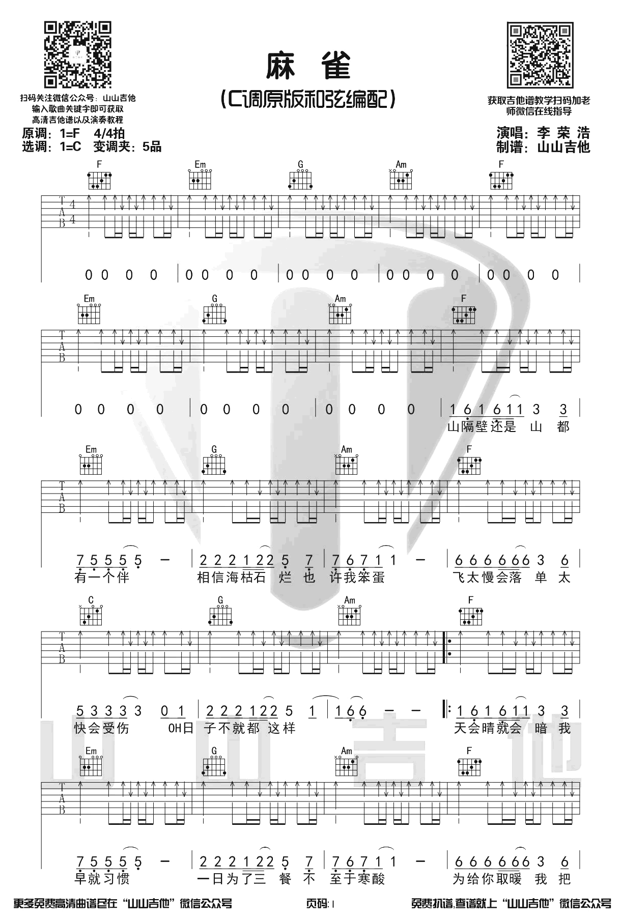 曲谱介绍: 《麻雀》李荣浩吉他谱,原调F,选调C,原版和弦编配,变调夹夹第五品。麻雀六线谱,三张图片谱,山山吉他编配出品并带来配套吉他弹唱视频,,琴谱网整理上传。 一首温暖冬日的新歌,昂扬的旋律,励志的气场,充满了现实与理想的交战感,唱给城市里追梦的普通人,鼓励我们勇敢面对前方的种种困难。