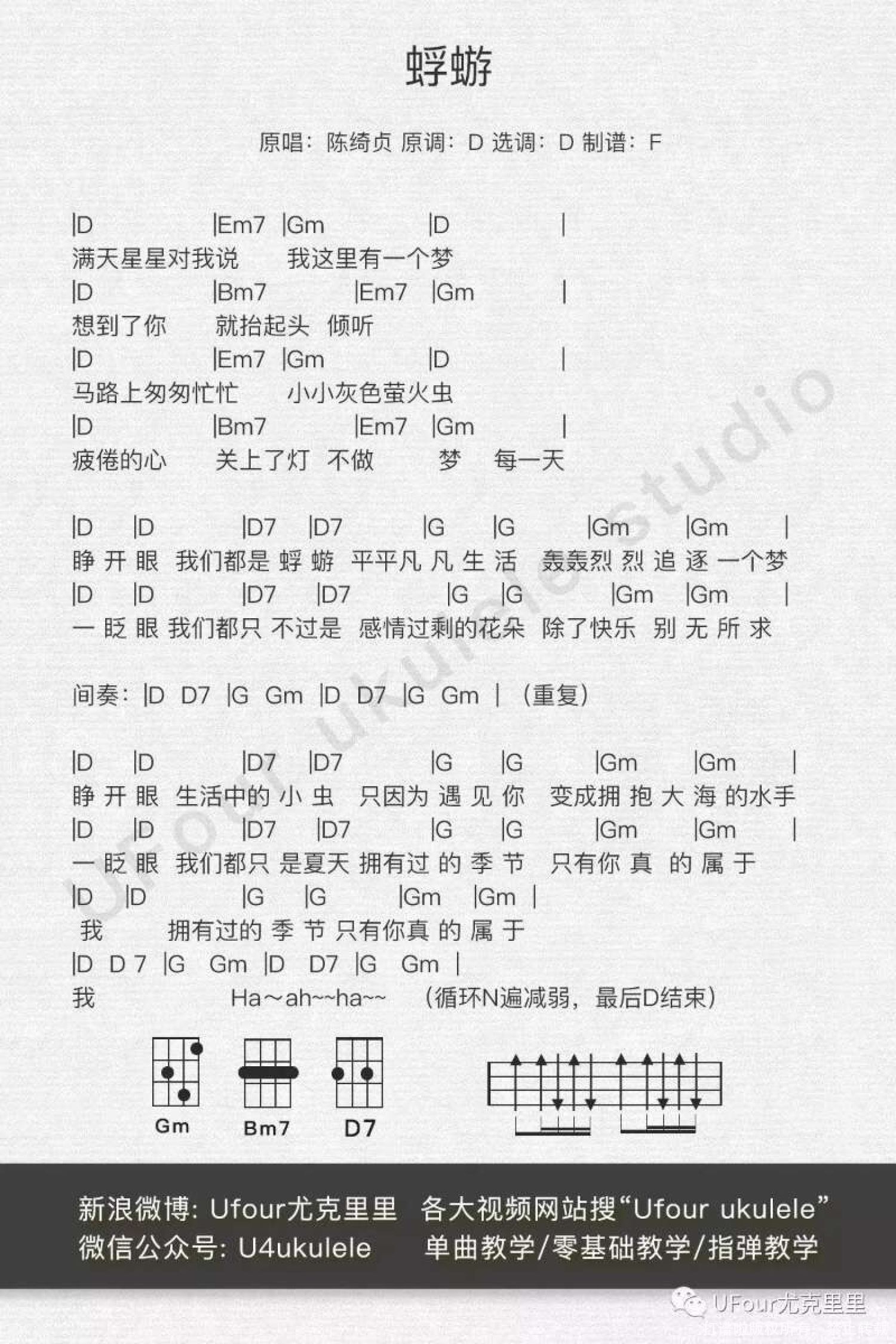 曲谱介绍: Aloha,大家好我是f。今晚给大家带来陈老师的《蜉蝣》教学。 上周查资料做公开课PPT的时候,看了一遍陈老师的在2010年简单生活节的一个现场视频,正好就是《蜉蝣》这首歌。 她说:「我常以为创作是孤独的,生命也是孤独的。我以往以为蜉蝣不过是一种朝生暮死的小生物,后来在网络上看到一篇文章,是在夏日午后的一个山谷,在水面上,有成千上万的蜉蝣飞舞,就像在夏日里下了一场壮观的雪。可能我们都觉得自己是渺小的,那是没见过自己追求梦想的样子。 所以我就用这把小小的吉他,写了这首歌,送给身边的朋友,也送给一样在追求,想要过平静简单生活的你们。」 最后她说:“愿你们能够过上自己梦想中的完美日子。”     演示视频   教学视频 “愿你们能够过上自己梦想中的完美日子。”   尤克里里谱