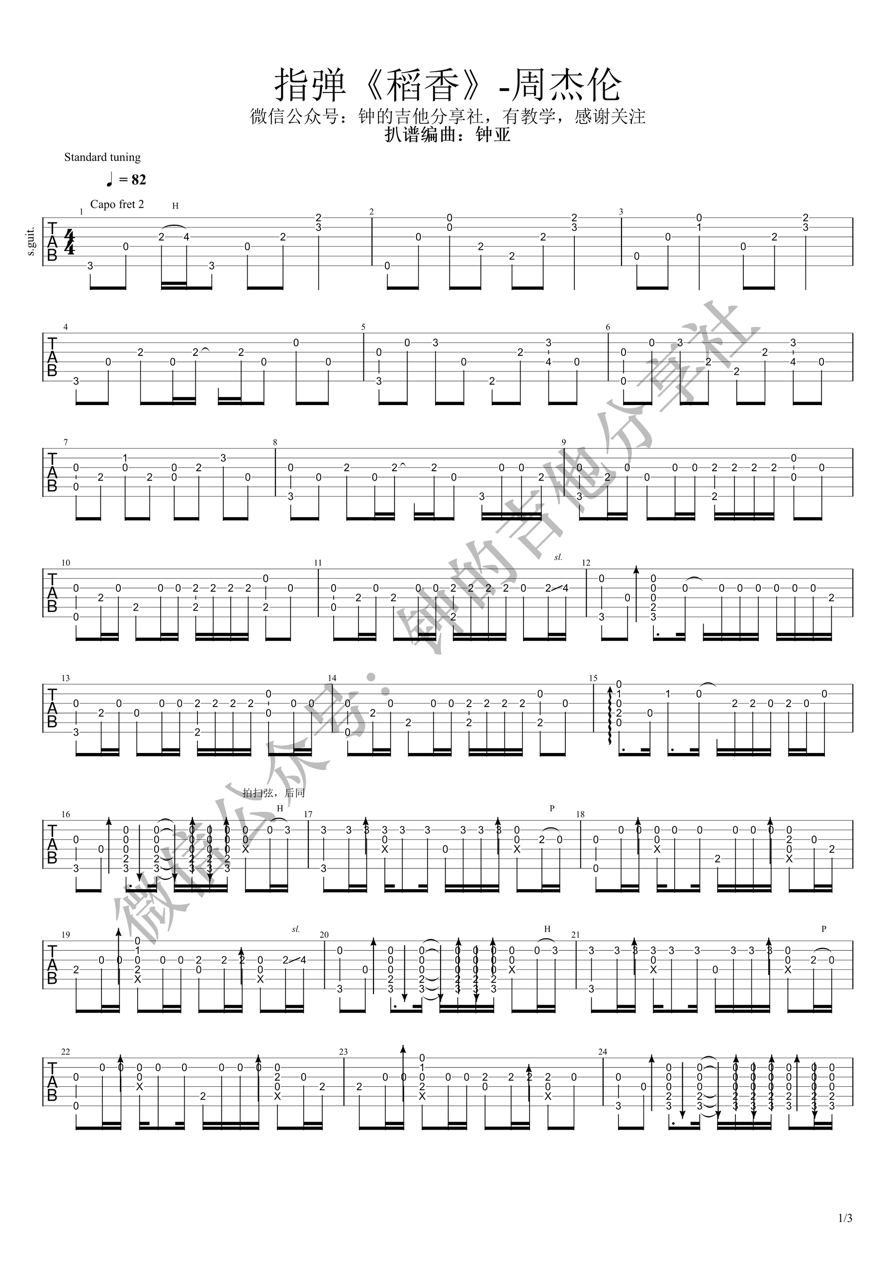 曲谱介绍: 稻香指弹吉他谱,周杰伦代表歌曲改编,稻香吉他独奏谱,这首歌原调A调,变调夹加2品,G调指法编配。钟的吉他社扒谱出品,并为琴友们带来曲谱配套指弹吉他演奏视频,琴谱网整理分享。 钟亚老师编配说明:花了近一个星期才把这首歌扒完整,节奏真的很复杂,尤其是rap部分。 G调各级和弦:G-Am-Bm-C-D-Em-#Fdim(或D7和弦) 整首歌的和弦走向:G-D-Em-Bm-Am-D-G 所以和弦级数走向:1-5-6-3-2-5-1 应该是卡农和弦走向15634145和经典副歌和弦走向4536251的有机结合。