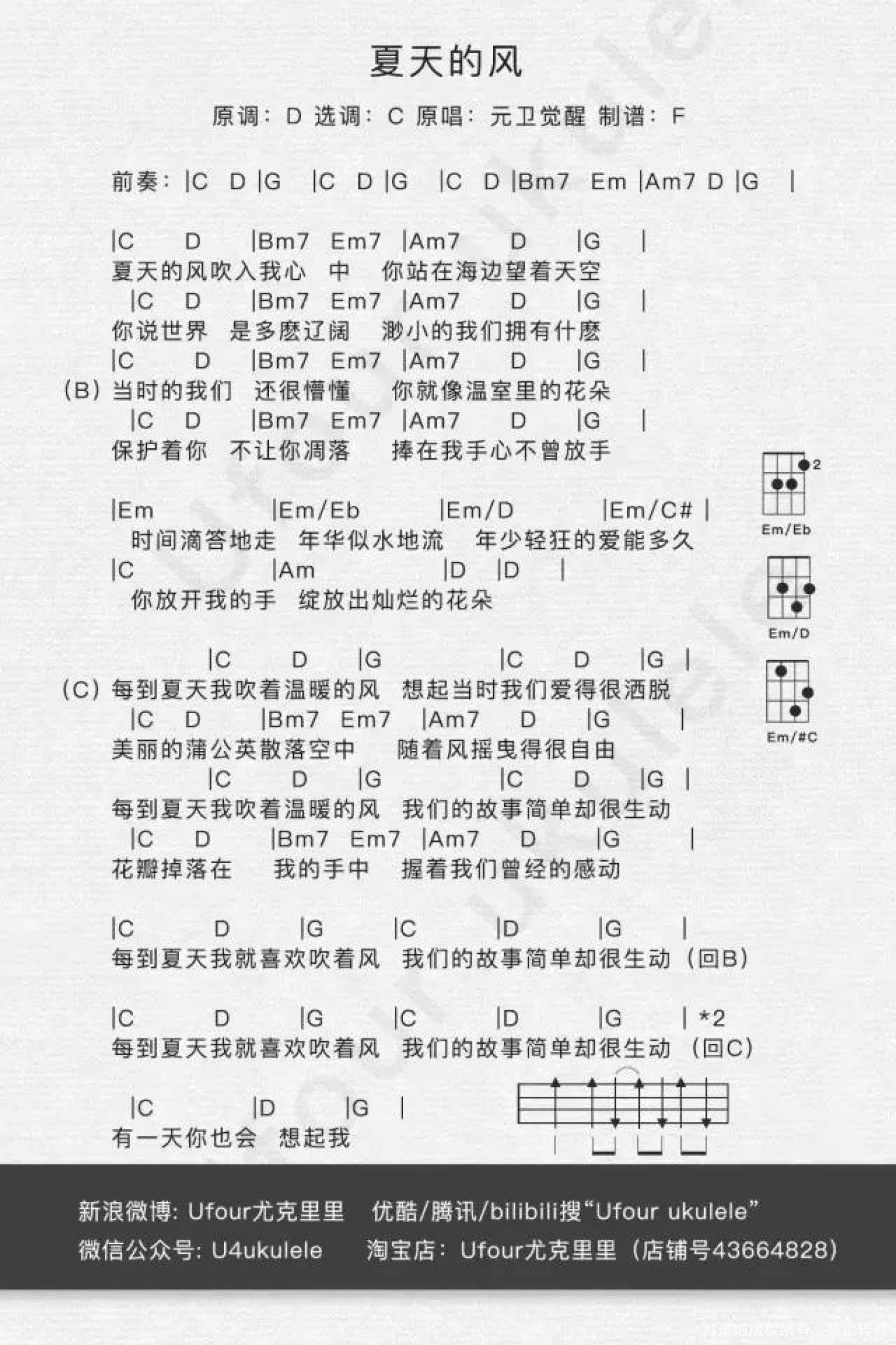 曲谱介绍: Aloha大家好~新的一期ukulele弹唱教学出炉啦,这次的曲子来自台湾乐队——元卫觉醒的《夏天的风》。 这可是05年发行的老曲子了,可以说是慢慢的童年回忆呀,那个时候我还不是“圆形”的我QAQ。 充满时代感的专辑封面啊 虽然从时令上来讲现在已经不是夏天了,不过坐标广州,除了冬天,其他时候都是夏天哈哈。   歌曲MV 莫名喜感····· 元卫觉醒是台湾的男子音乐创作组合,由是元介和卫斯理二人组成。团体名称除了取自他们的名字是是“元”介和“卫”斯里之外,还代表了他们的创作是一种原创的音乐新口味,而“觉醒”则是象征他们选择音乐创作做为自己未来人生方向的一种决定。元卫觉醒在2006年以专辑《幸福下载》入围第17届金曲奖最佳演唱组合。   弹唱教学 这首曲子原调的是D调的,我做了C调的谱,比较简单,算是入门级的曲子吧。谱子po上来了,有不懂的地方记得留言问我哦,看到的第一时间就会回复。 尤克里里谱