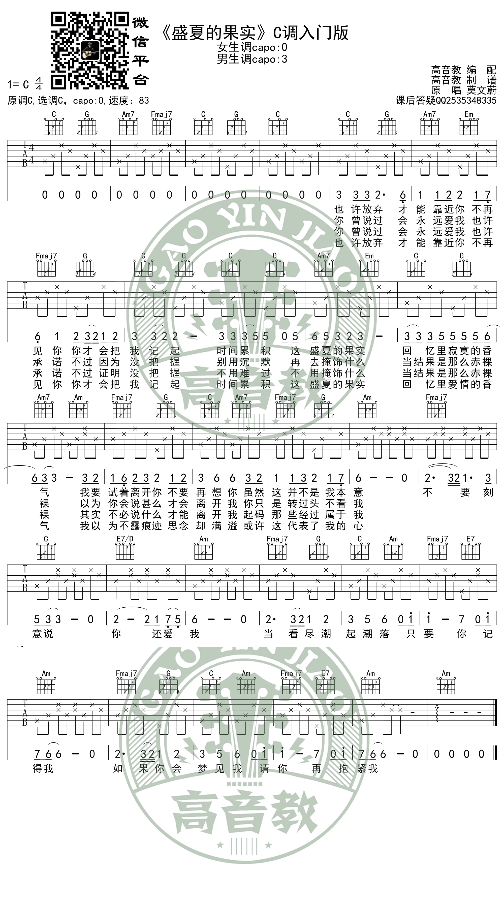 曲谱介绍: 《盛夏的果实》吉他谱,莫文蔚演唱,C调指法,入门版弹唱谱,女生不用变调夹,男生建议夹三品。盛夏的果实六线谱,高清图片谱,高音教编配,琴谱网更新分享。 原曲来自日本歌手UA演唱的《水色》,莫文蔚以慵懒的声音,吟唱着都市女子的情感挣扎,独特的嗓音和味道,像美酒加咖啡,陪伴着每一颗受伤的灵魂。