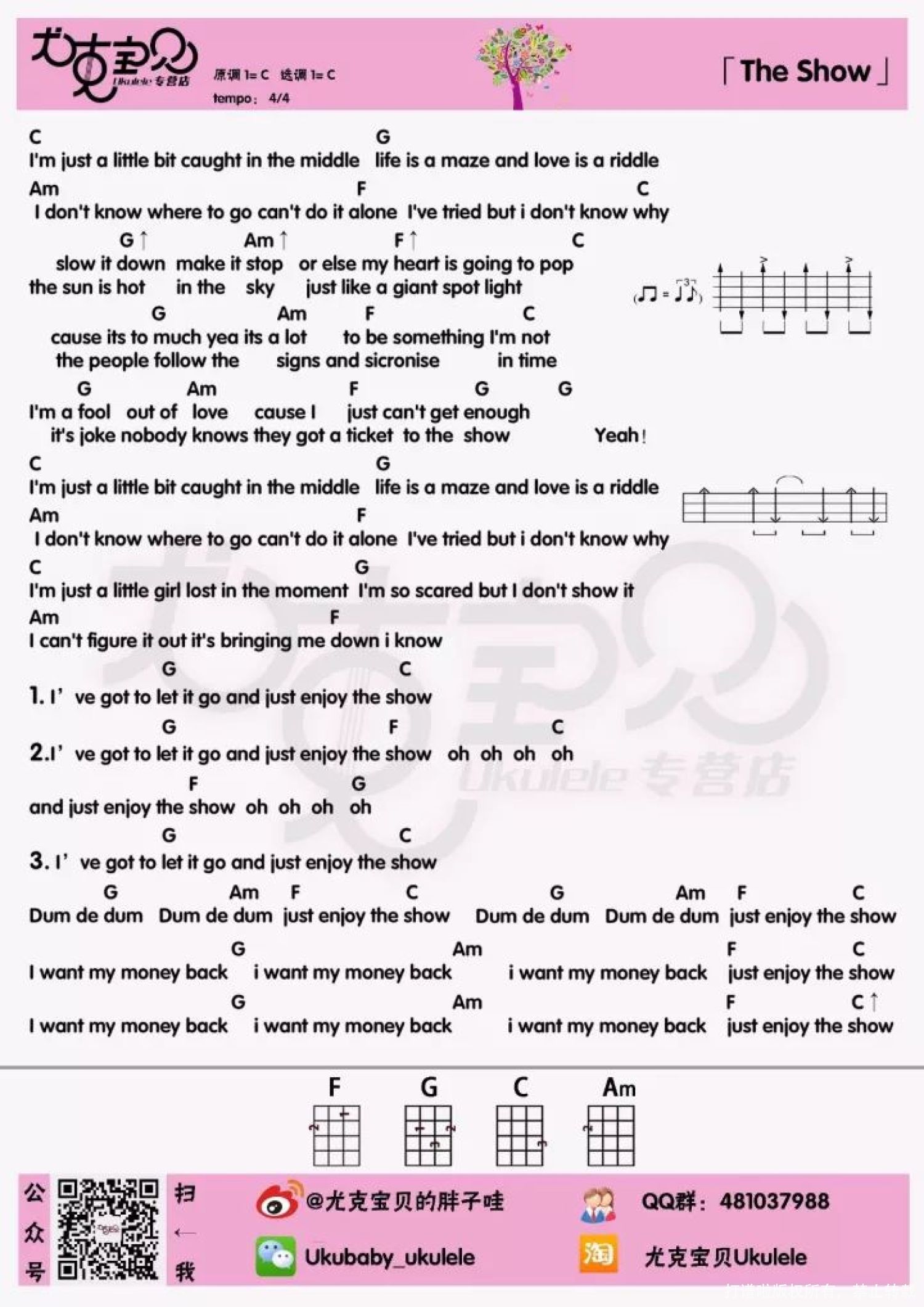曲谱介绍: ♪ ALOHA ♪ 我 是 胖 子 哇 大家好我是练完琴少女心的子哇    我今天又勤劳地更新了! 我好调皮噢噢噢! 今天晚上在Finger上的直播课开课, 好紧脏噢!   给大家带来Lenka的清新小曲「The Show」 据说弹完了这首歌,少女心会大爆发! ●「The Show」是澳大利亚女歌手Lenka演唱的独立流行歌曲,它的音乐视频被作为Old Navy商业品牌以及电视剧<丑女贝蒂>的的主题曲,还曾为卡通犬夜叉广告配乐。 ●  这首歌作为首张同名大碟《LENKA》的开场曲,轻巧舒服,倚着曼妙的琴韵随处飘扬,加上Lenka的嗓音甜而不腻像个小淘气般游移其中,绝对是一首一听钟情的歌曲。 ●  歌曲旋律轻快活泼,但歌词其实描述的是一个迷茫的小女孩。面对现实,这个单纯的小女孩有些无奈,甚至有些悲伤。 ● 此外,据说这还是一首唱给马云的歌,因为歌曲结尾一直在重复“I want my money back……”(老板说要剪出来用作起床闹铃!)   胖子哇弹唱教学 弹唱曲谱 胖子哇指弹Cover