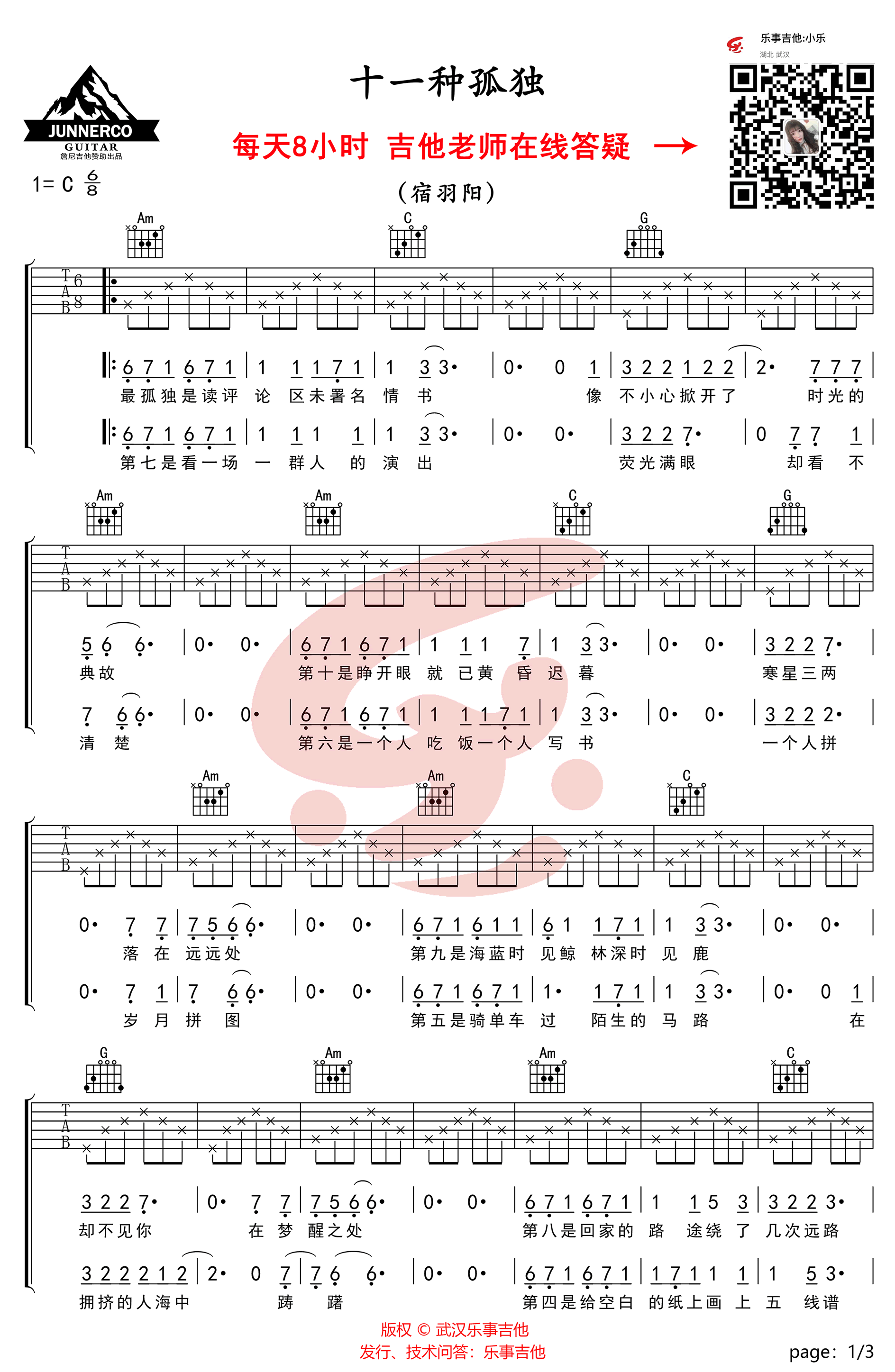 曲谱介绍: 十一种孤独吉他谱,宿羽阳演唱的一首民谣歌曲,C调简单版,十一种孤独六线谱,三张高清图片谱。随谱附上吉他弹唱教学视频,感谢乐事吉他编配出品,琴谱网整理分享。歌名源自美国作家理查德·耶茨创作的一部短篇小说集,歌曲浅吟低唱间,细腻深刻的把现代人不同的孤独状态描绘得入木三分。