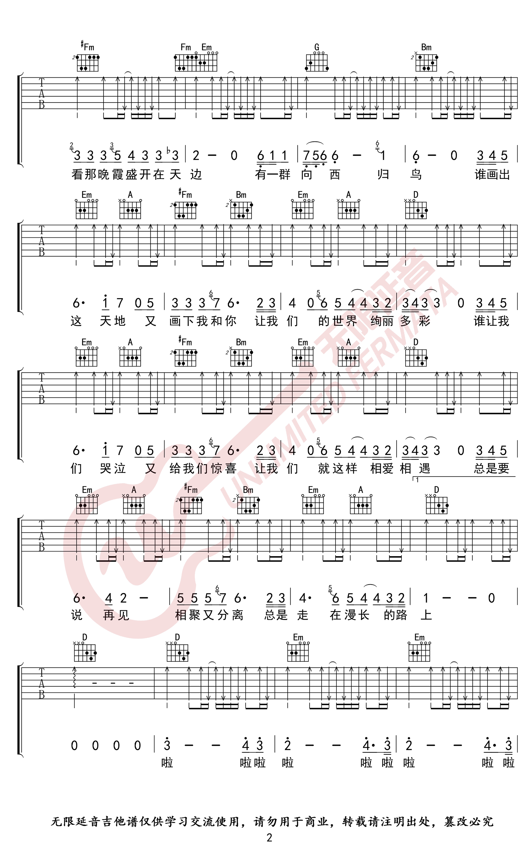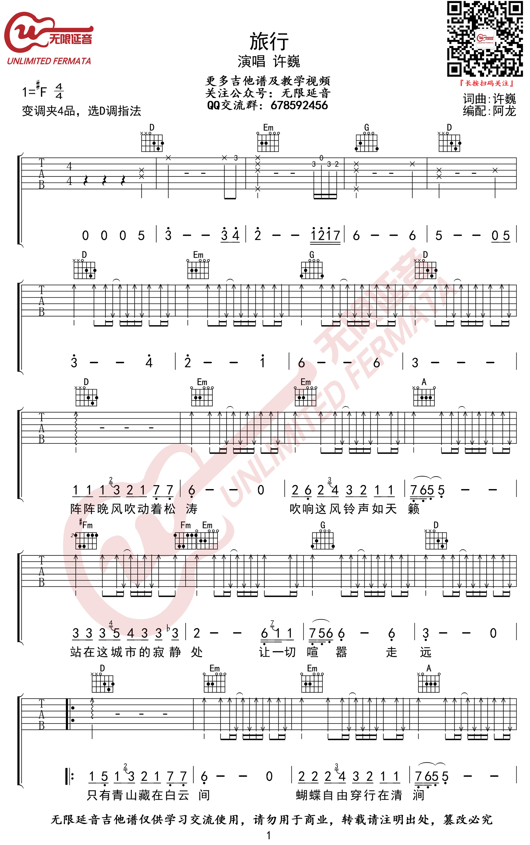 曲谱介绍: 许巍《旅行》吉他谱,原调升F,变调夹夹第四品,选用D调指法。谁画出这天地,又画出我和你,许巍的一首经典歌曲,旅行六线谱,三张高清弹唱图片谱,无限延音阿龙编配,琴谱网上传分享。