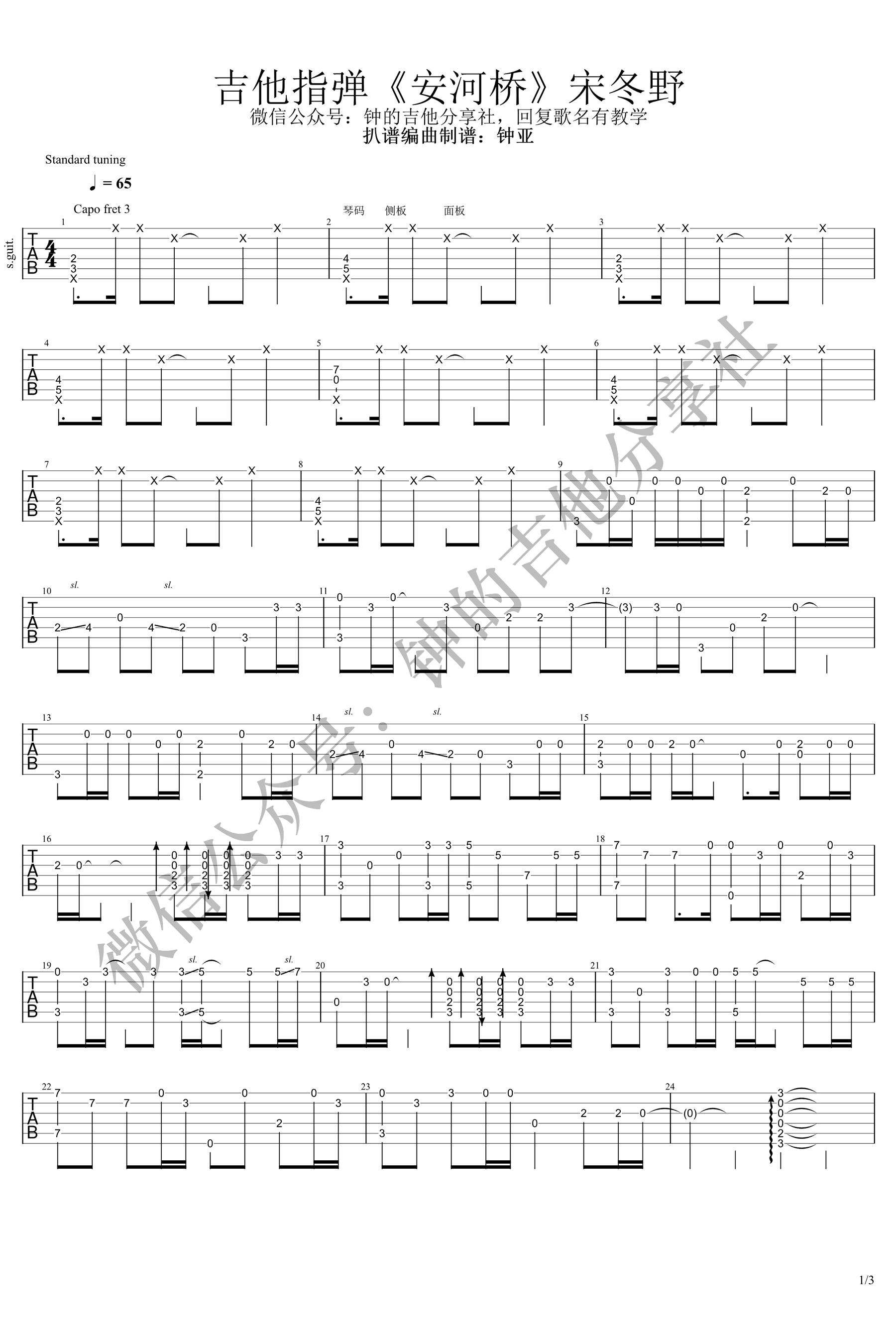 曲谱介绍: 安和桥指弹谱,根据宋冬野经典民谣歌曲改编,安河桥吉他独奏谱,CAPO夹三品,三张图片谱,钟的吉他社编配,并提供配套吉他指弹演示视频。琴谱网上传分享。曲谱编配演奏说明:《安河桥》G调的歌曲,用G调指法编配的,变调夹本该不加,但加了变调夹声音会变得很清脆,我变调夹加3品,所以弹得是升A调 G调和弦:G-Am-Bm-C-D-Em-Fdim(或D7) 歌曲副歌部分和弦走向:C4级-D5级-Bm3级-Em6级-C4级-D5级-G1级,显然,经典的4536451走向,是4536251稍微变过来的。