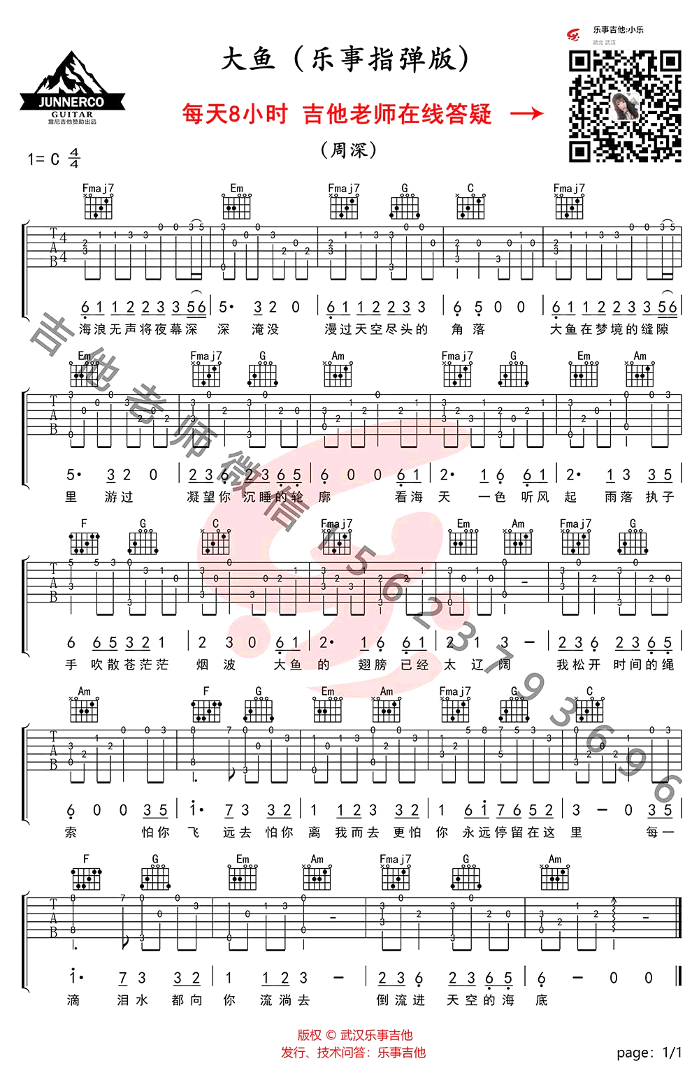 曲谱介绍: 大鱼指弹吉他谱,周深演唱,《大鱼海棠》动画电影印象曲,大鱼吉他独奏谱,C调编配,乐事吉他出品,并为同学们带来曲谱配套教学视频,琴谱网整理分享。 一曲非常好听简单的指弹,勾勒演绎出古风古韵的唯美画面,细腻动人悠远绵长的旋律给人无尽的回味。琴友们跟随老师的讲解示范,加油练习!