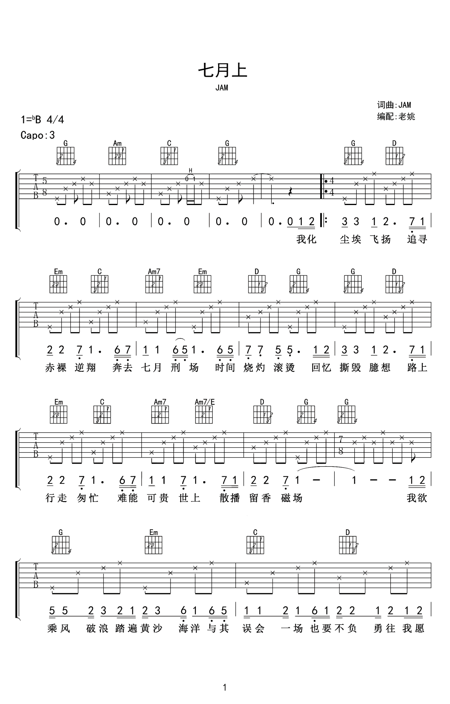 曲谱介绍: 七月上吉他谱,Jam的一首原创民谣歌曲,吉他简单版本编配,适合吉他初级琴友们,七月上六线谱,高清弹唱谱,G调指法,变调夹夹三品,