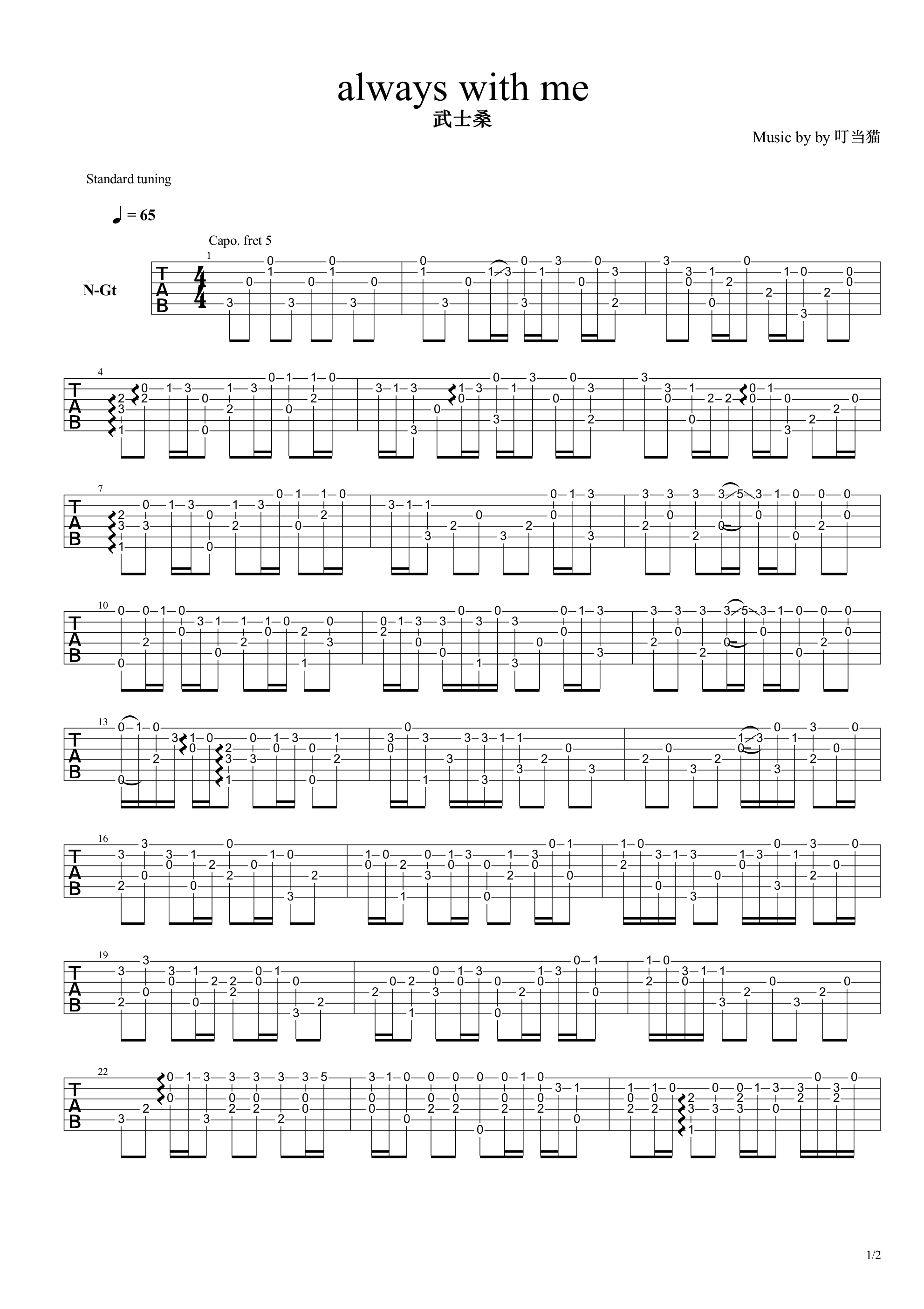 曲谱介绍: Always with me指弹谱,武士桑改编版本,宫崎骏动画电影《千与千寻》主题曲,亲爱的旅人啊,Always with me吉他独奏谱,Capo夹五品,感谢叮当猫编配,随谱附上《Always with me》吉他指弹演奏视频。琴谱网整理分享。武士桑:恭喜【千与千寻】在中国公映,所以弹弹看了。当543某一天遇到了「千と千寻」,我常常这么想道,是现在琴弦共鸣着的温柔啊。