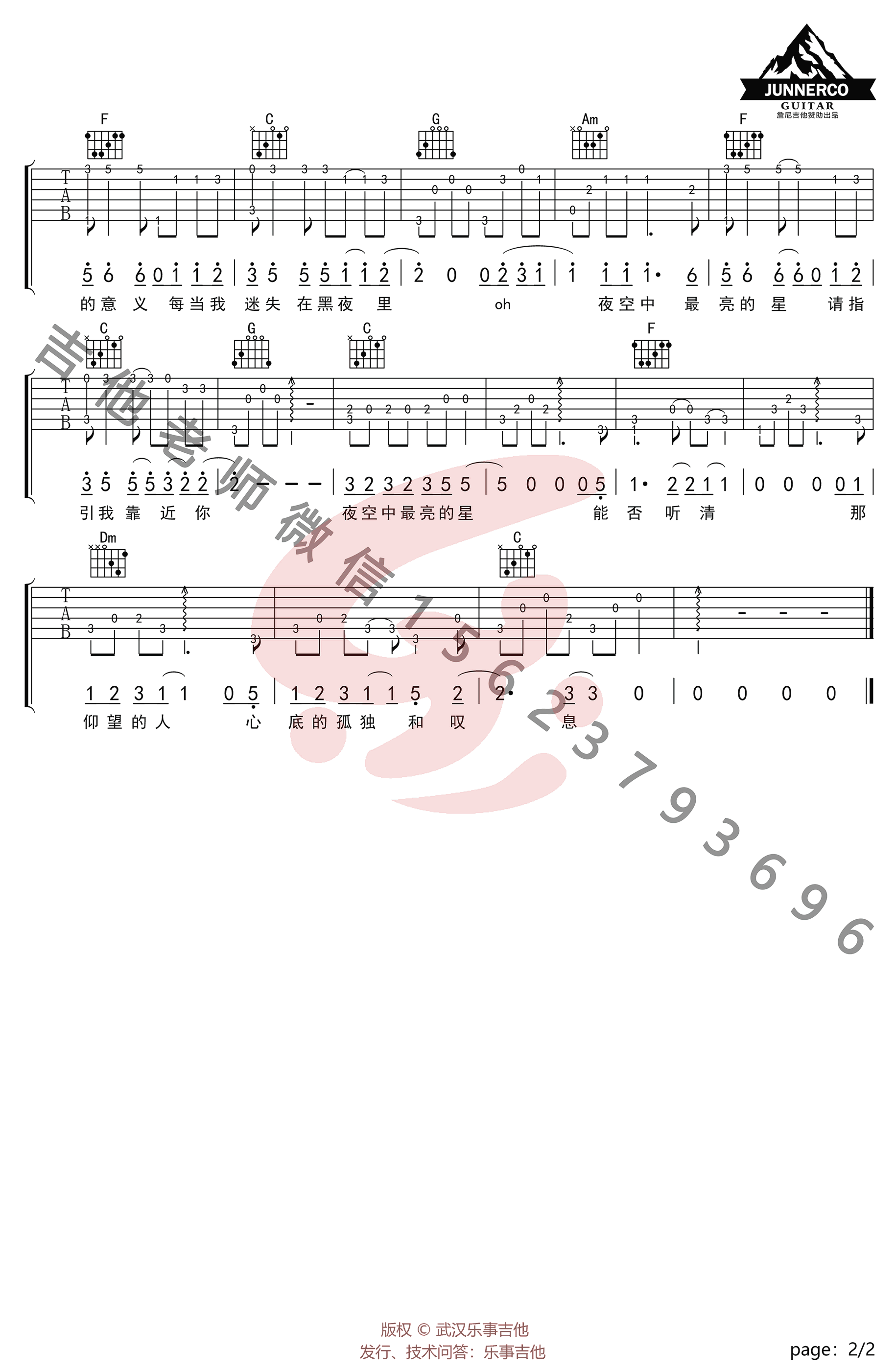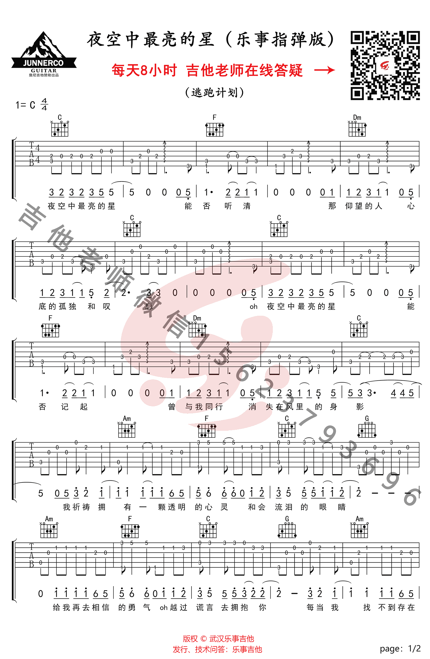 曲谱介绍: 夜空中最亮的星指弹谱,根据逃跑计划乐队的经典励志歌曲改编,C调指法,两张高清图片谱。夜空中最亮的星吉他独奏谱,简单版教学视频随谱附上,乐事吉他出品,琴谱网上传分享。