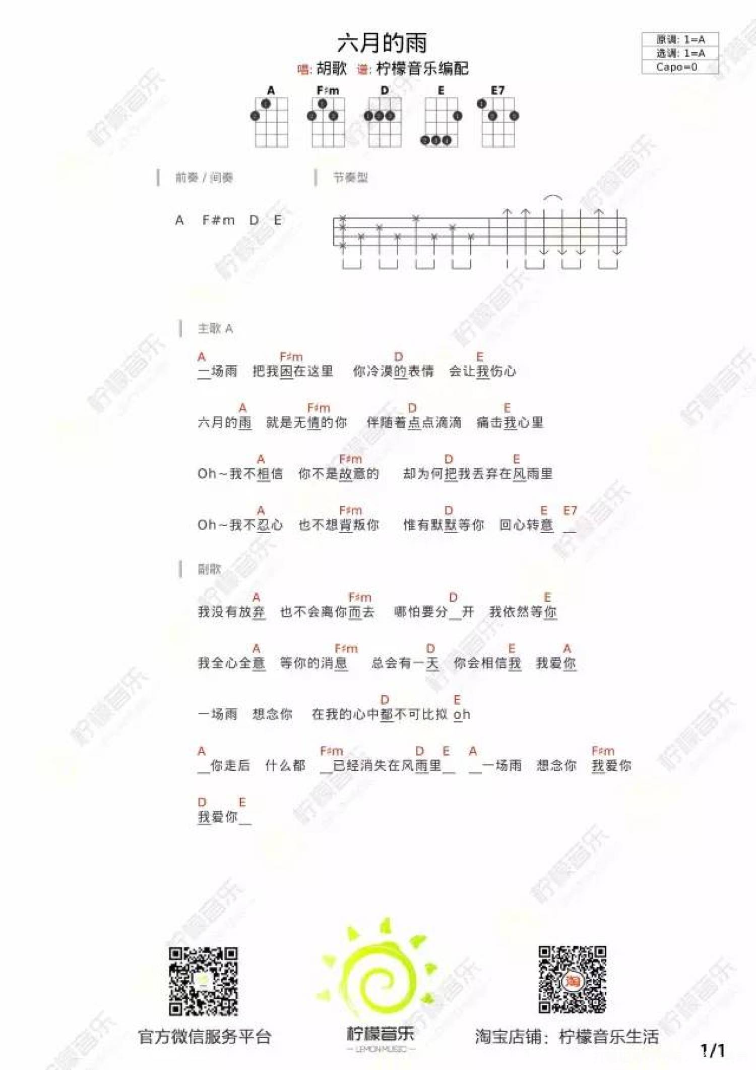 六月的雨尤克里里谱 - 胡歌