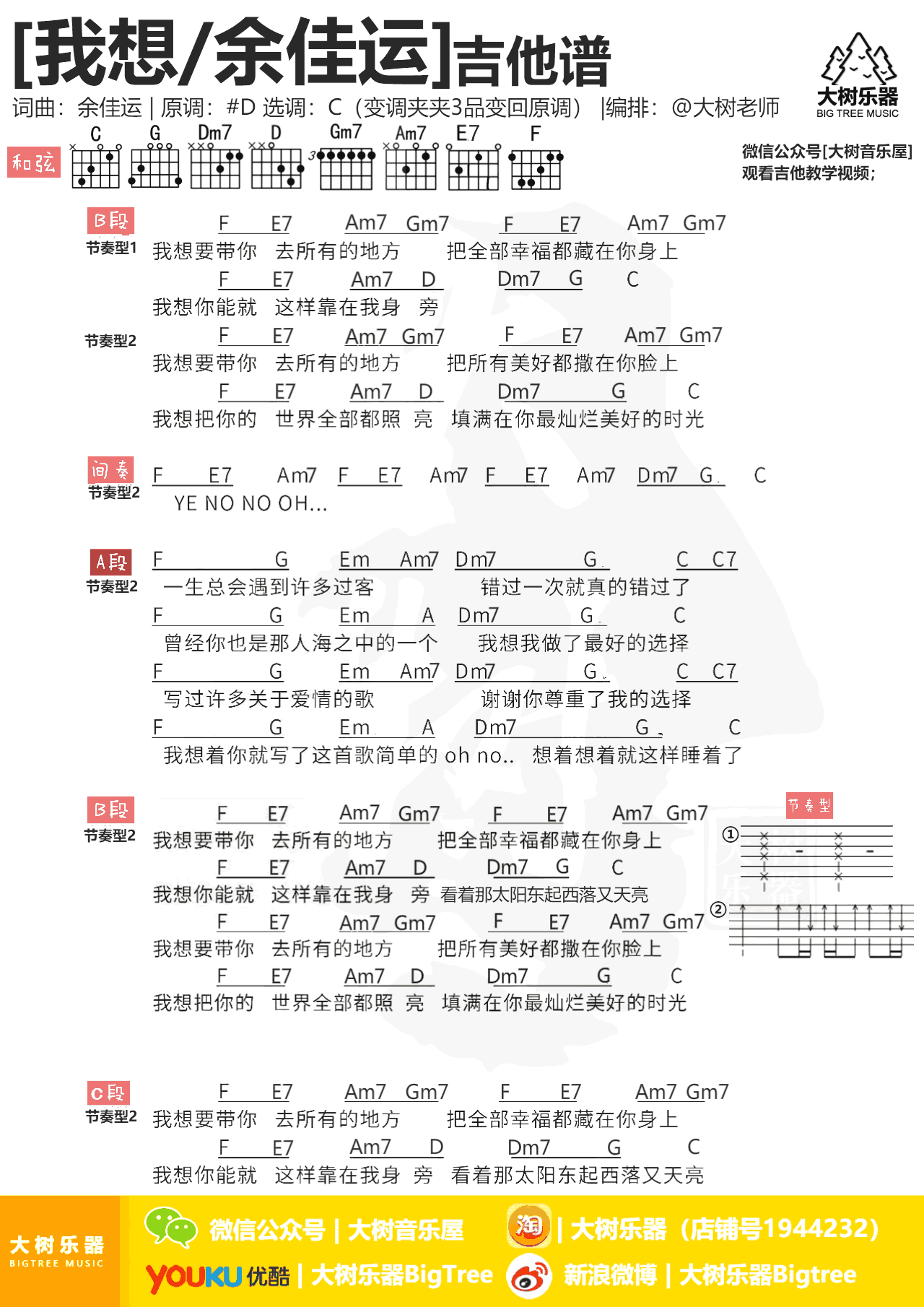 曲谱介绍: 我想吉他谱,余佳运创作并演唱的抒情歌曲,《我想》吉他弹唱谱,高清图片谱,原调#D,选用C调(变调夹夹3品变回原调)。感谢大树乐器的编配,琴谱网曲谱更新,欢迎吉他爱好者收藏分享。