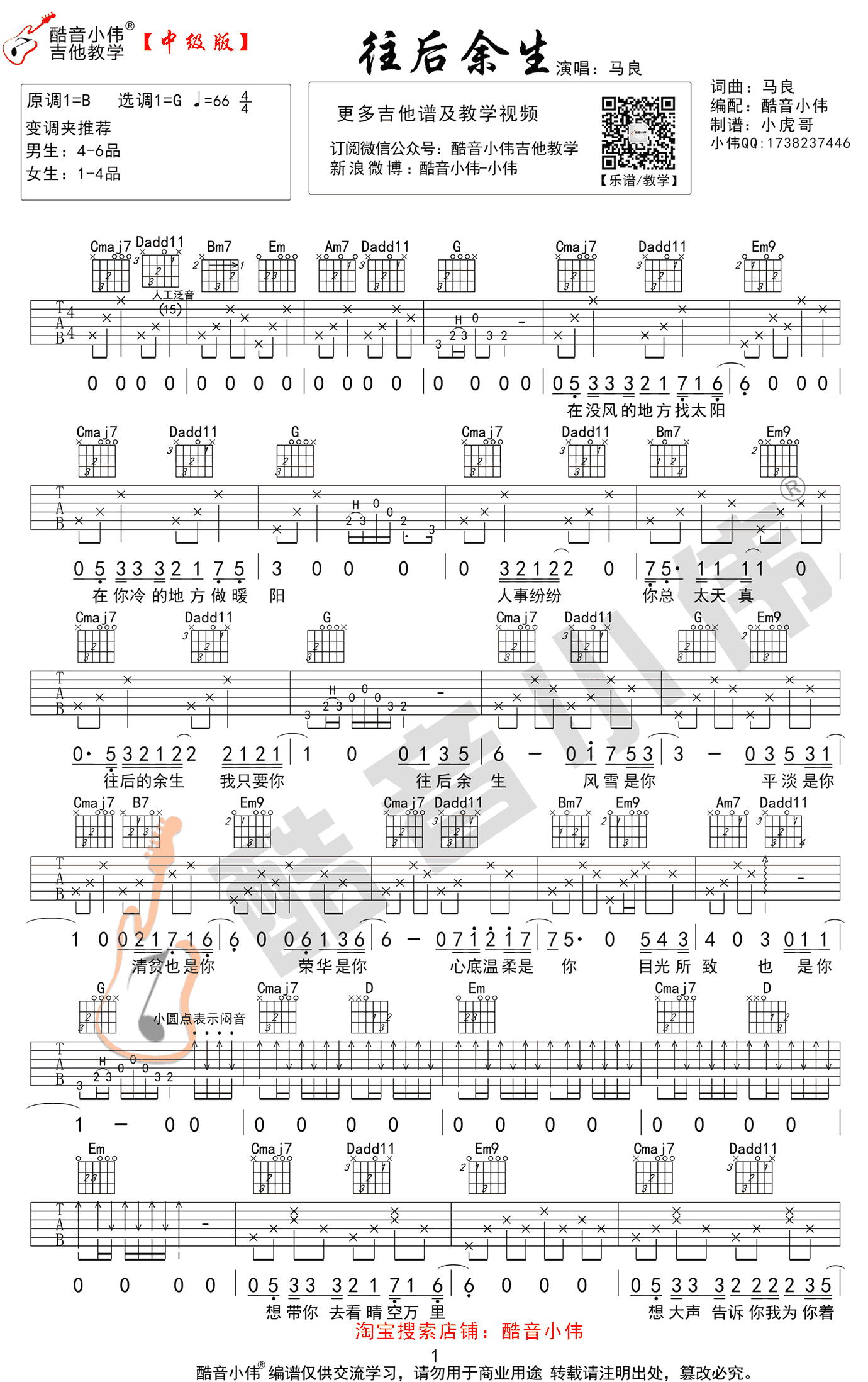 曲谱介绍: 往后余生吉他谱,马良原创民谣歌曲,《往后余生》六线谱,选用G调原版编配,男生变调夹推荐4-6品,女生变调夹推荐1-4品,高清图片谱由音小伟编配,配套吉他弹唱+教学视频,琴谱网推荐分享。这是一首特别容易令人感动的歌曲,动听的旋律总是叫人流连,琴友们学习起来吧。 学习歌曲弹唱的步骤 第1步:熟练弹会此首歌曲的和弦伴奏 第2步:能够熟练清唱出此首歌曲 第3步:弹唱结合此歌曲