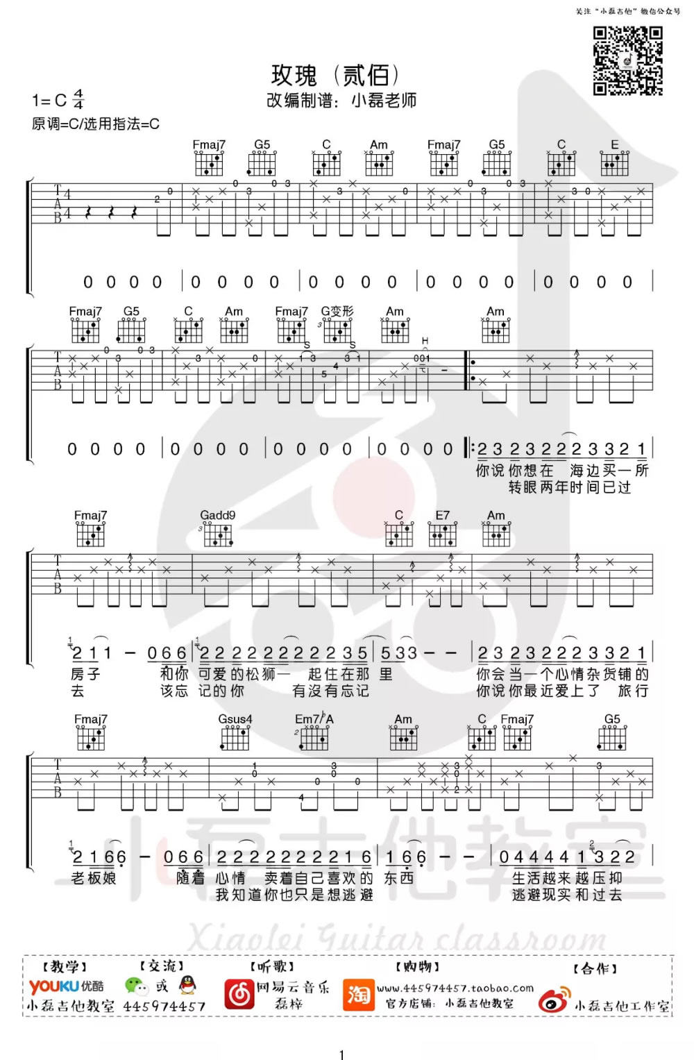 曲谱介绍: 玫瑰吉他谱,贰佰演唱的一首民谣歌曲歌曲,《玫瑰》六线谱,高清弹唱图片谱,选用原调C调指法,小磊吉他编配,并提供吉他教学视频,琴谱网推荐分享。
