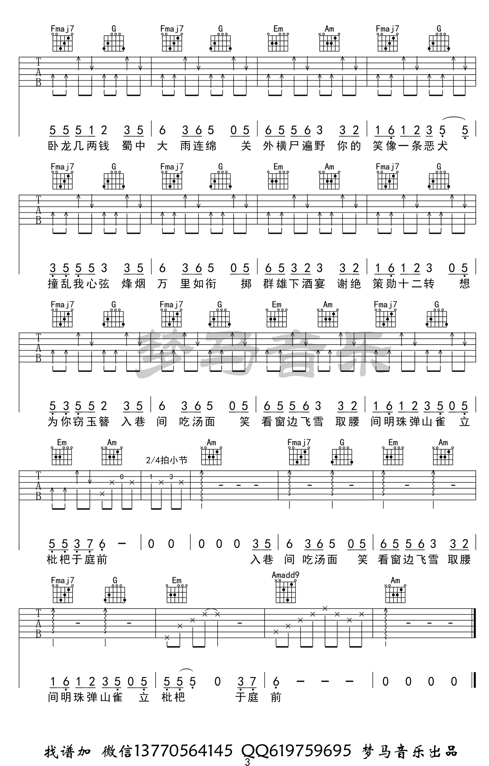 曲谱介绍: 盗将行吉他谱,花粥演唱的一首唯美古风歌曲,《盗将行》六线谱,三张高清弹唱谱,选用C调,梦马音乐编配,并提供配套吉他弹唱视频演示,琴谱网推荐分享。 要点讲解:这首歌曲我并没有进行多少改编,主要还是按着原曲的感觉做了出来。整首歌节奏都是基本一样的,比较好把握,适合节奏稳定性的练习。前奏和间奏是一样的,都是按着花粥原曲编的,稍加练习应该不难掌握。