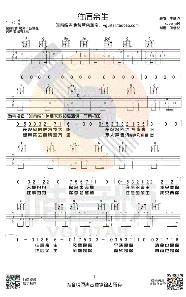 曲谱介绍: 往后余生吉他谱,王贰浪版,原唱马良,抖音热门歌曲《往后余生》六线谱,C调简单版,感谢唯音悦的编配和提供,琴谱网推荐分享。 编配讲解:这首歌女版编配需要降半音调弦,男生版的话直接变调夹夹2品即可了。整首歌主要是F-G-Am(C)的走向和F-G-Em-Am-F-G-C这两个走向而已~所以整首歌只要把这两个走向练好,就没啥问题了。