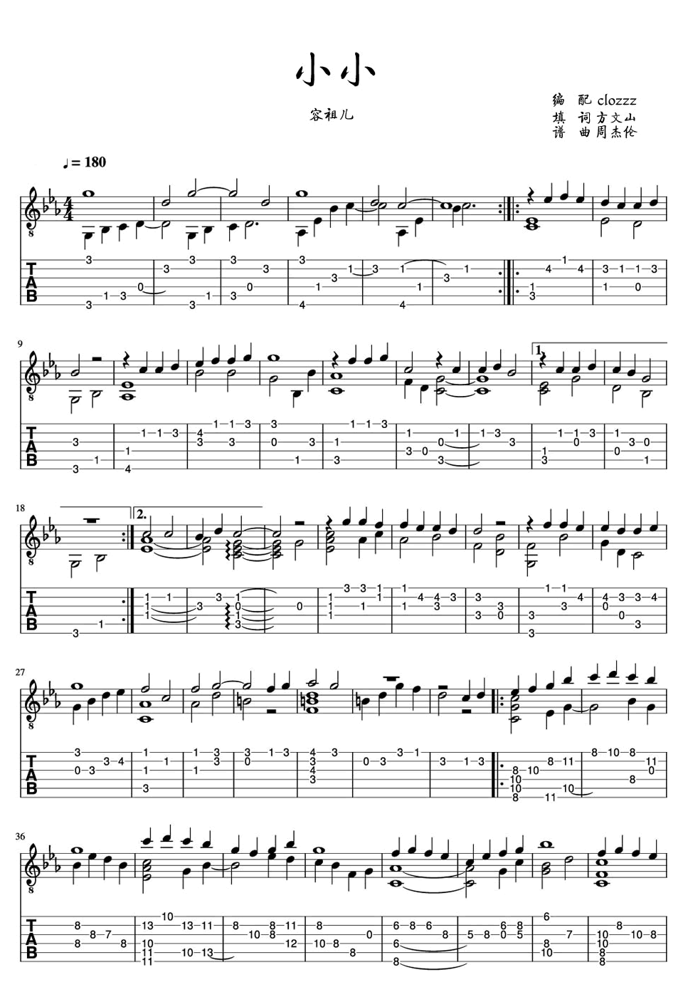曲谱介绍: 小小吉他谱,容祖儿演唱歌曲改编,小小吉他独奏谱,曲谱为CLOZZZ编配,琴谱网谱网站整理分享。 小小这首歌曲是方文山和周杰伦的一次完美合作,细腻柔情的歌词,旋律带着一份淡淡的愁绪,是那种听一遍就会让人喜欢上的歌。