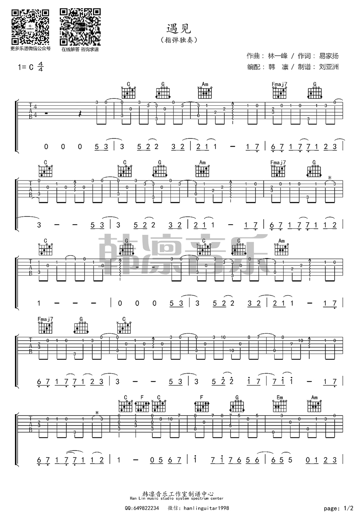 曲谱介绍: 遇见吉他指弹谱,孙燕姿《向左走向右走》主题曲,遇见指弹吉他独奏谱,C调指法,两张图片谱,韩凛音乐编配分享,我在茫茫人海中遇见你,就像音符找到特定的旋律。